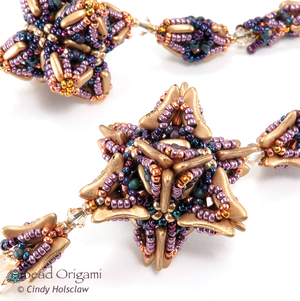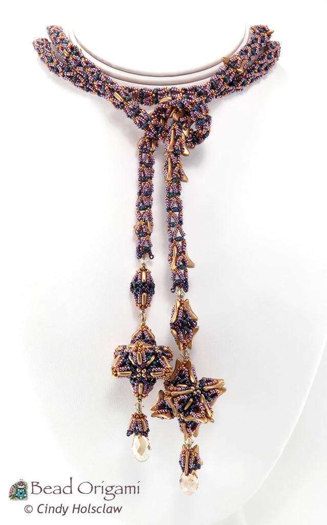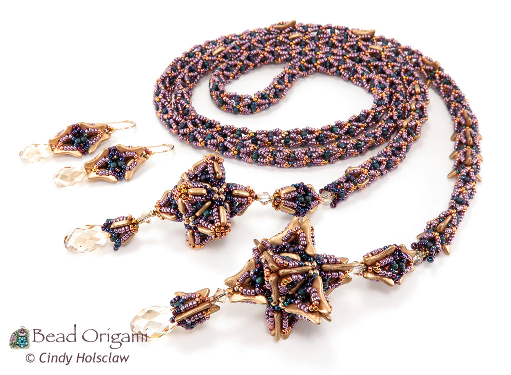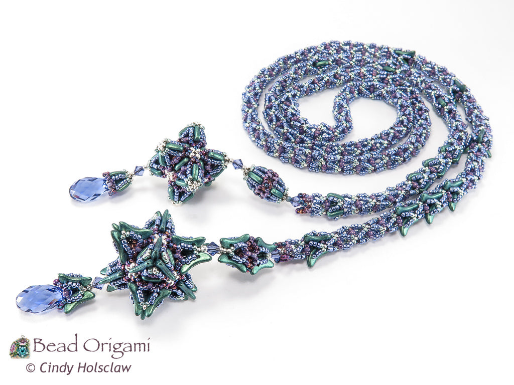 This pattern is appropriate for beaders who are familiar with right-angle weave and circular peyote and who would like to learn how to incorporate 2-hole beads into these techniques. Previous knowledge of Hubble Stitch is a plus but is not required to follow this pattern. The pattern includes detailed step-by-step instructions showing how to weave each component of the lariat, how to attach the components together, and how to weave the matching earrings. Try incorporating the beaded beads and the beaded rope into other types of jewelry, or combine this design with the Supernova Pendant for even more possibilities!