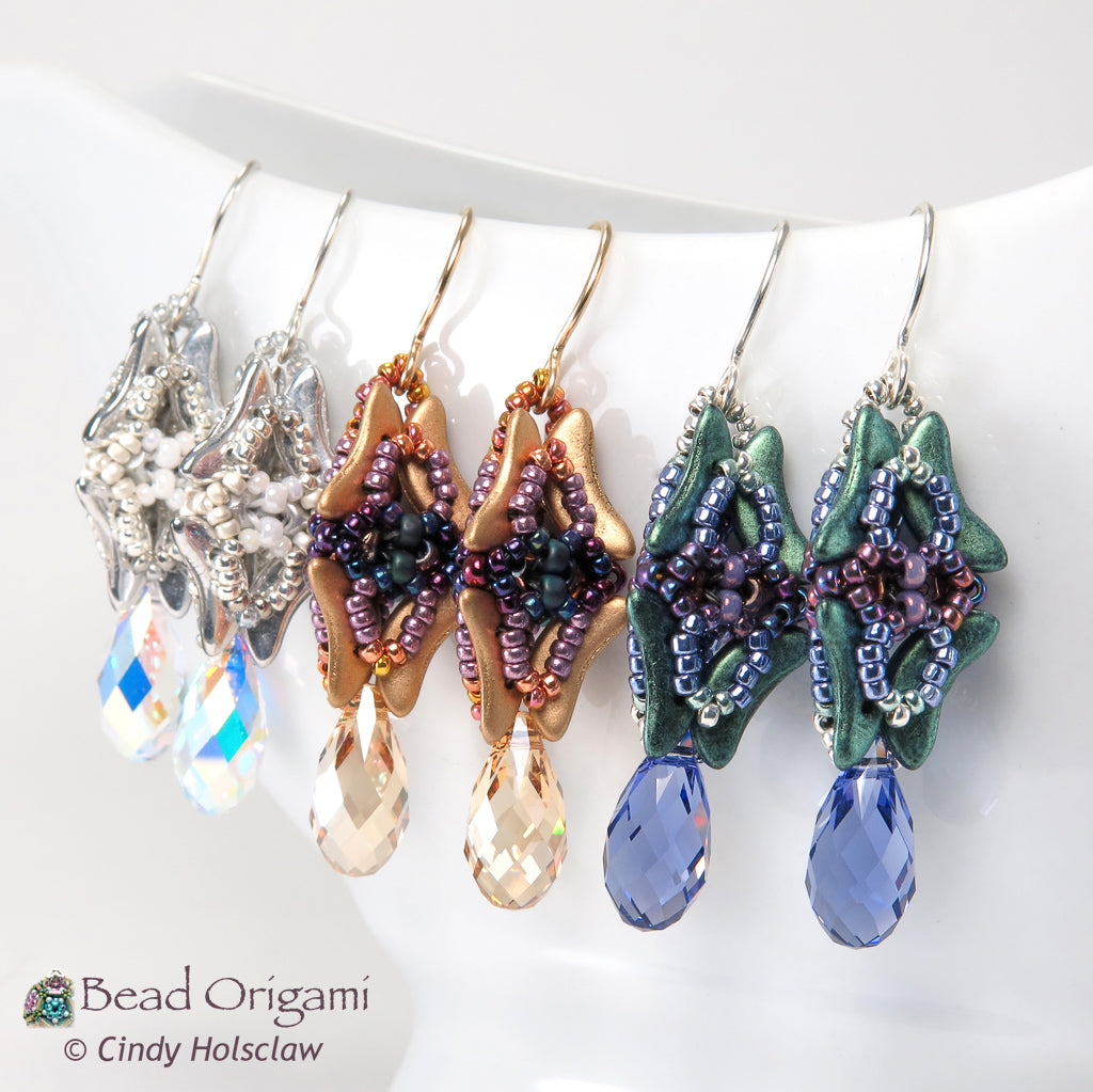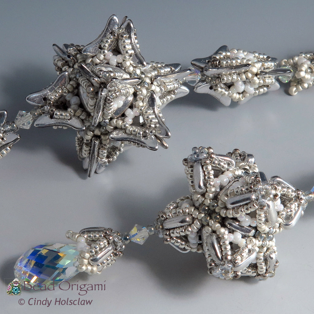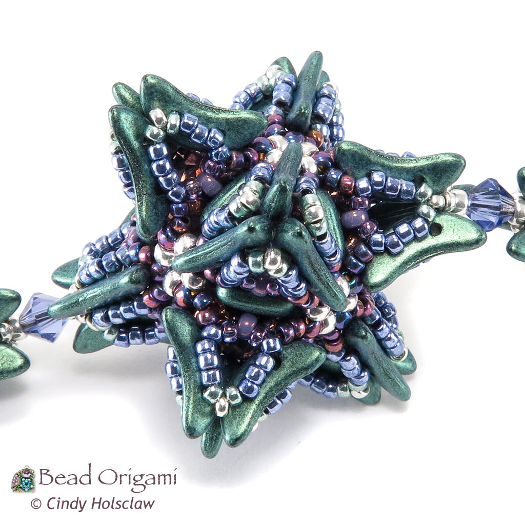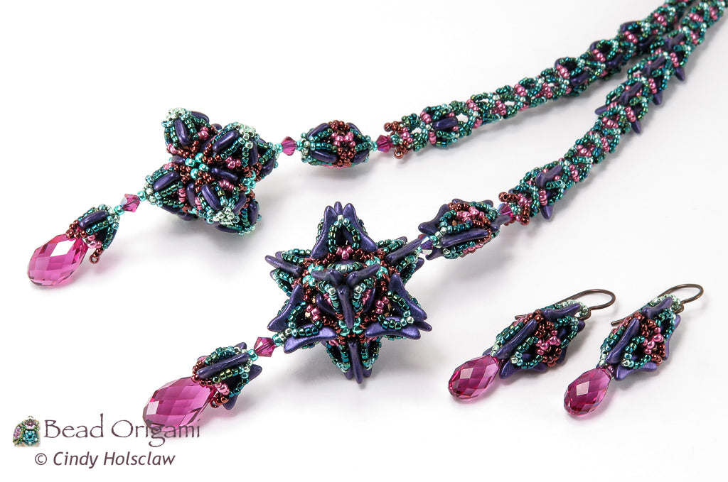 This pattern is appropriate for beaders who are familiar with right-angle weave and circular peyote and who would like to learn how to incorporate 2-hole beads into these techniques. Previous knowledge of Hubble Stitch is a plus but is not required to follow this pattern. The pattern includes detailed step-by-step instructions showing how to weave each component of the lariat, how to attach the components together, and how to weave the matching earrings. Try incorporating the beaded beads and the beaded rope into other types of jewelry, or combine this design with the Supernova Pendant for even more possibilities!