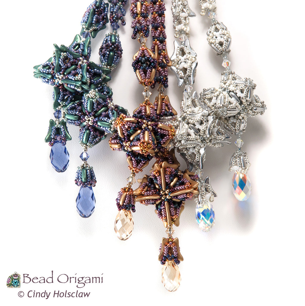 Stitch a fancy lariat with a collection of 2-hole beads! The Comet Trails beaded lariat features two different types of beaded beads, a decorative crystal component, and a long beaded rope. The self-supporting focal beaded beads on each half of the lariat feature the geometry of the cube, and they can be embellished with either bars or crescents to show off the unique shape of each 2-hole bead. Create the beaded rope with a variation of Hubble stitch; a lacy, open beadweaving stitch that makes a light, hollow rope. Finish the set with a pair of fancy matching earrings!