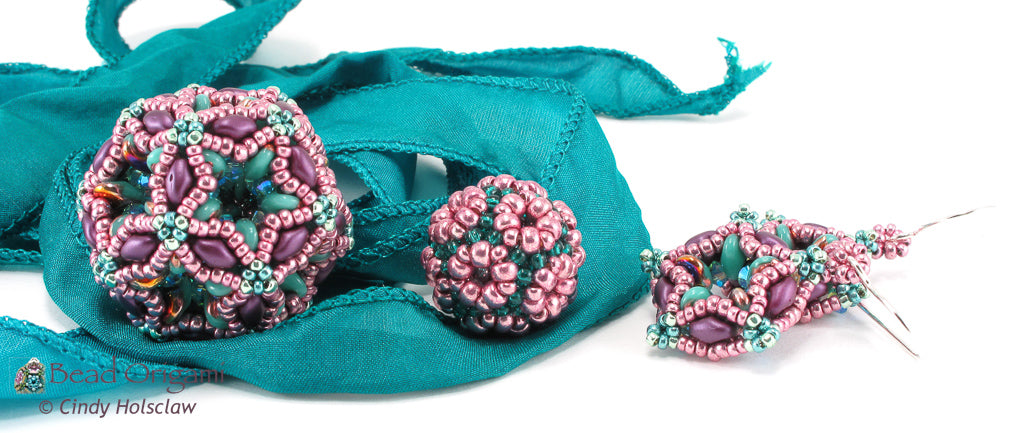 The Fiberoptic Dodecahedron Set is three designs in one! The pattern starts with the beaded bead, which is a sturdy little beaded bead woven from two different sizes of seed beads. The pattern proceeds to the cornerstone of this set, the Fiberoptic Dodecahedron Pendant (check out my free Candy Dodecahedron pattern for an introduction to dodecahedron beaded beads). This design features two-hole SuperDuo beads woven together using in a unique, layered construction technique, and also features bicone crystals in the center of the pendant to mimic the inside-out sparkle of a geode. The resulting pendant is hollow, but stiff and very sturdy, and its holes are large enough so that it can be strung on a chain, cord, or a silk ribbon. Finally, the delicate Fiberoptic Earrings echo the star-shaped faces of the pendant, and these earrings are the perfect companions to complete this geometric set. Combine these designs with the Fiberoptic Duo Beaded Beadsfor even more possibilities.