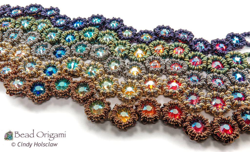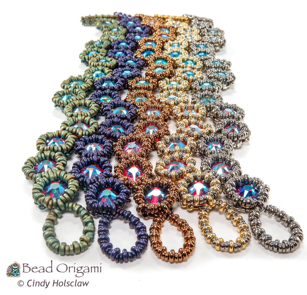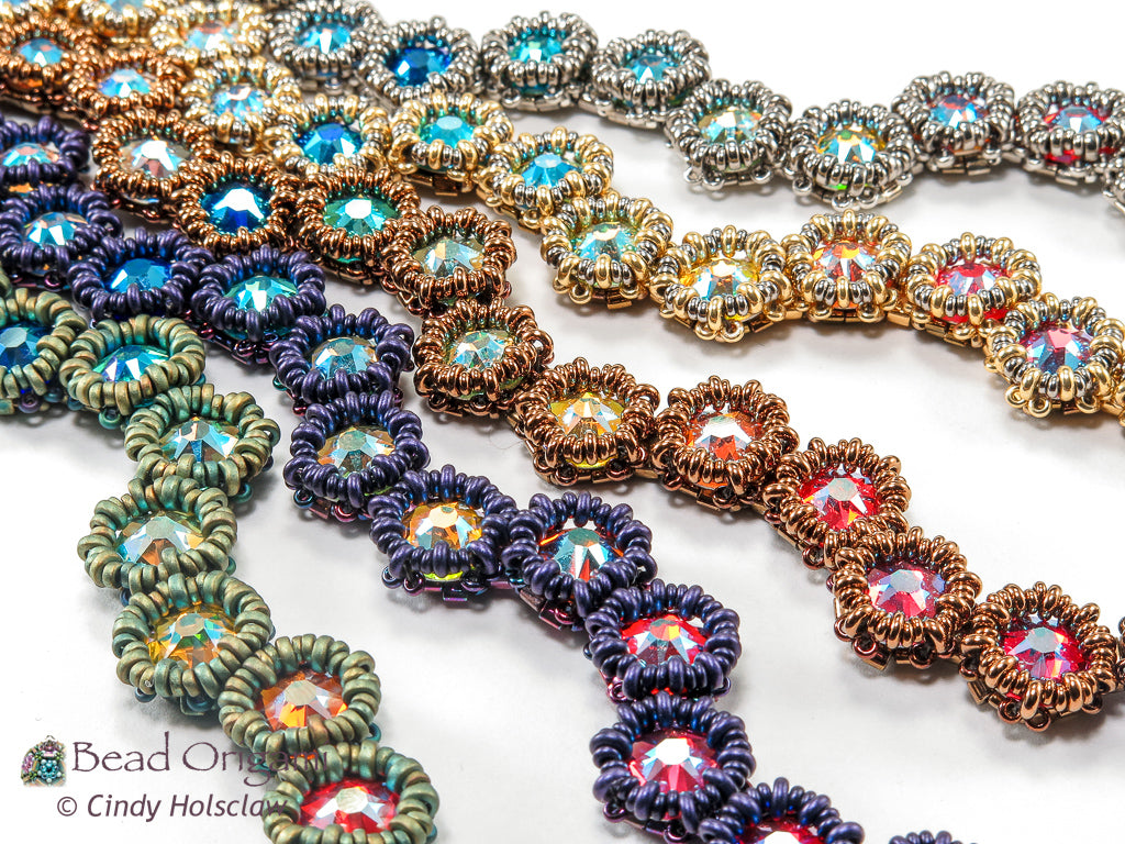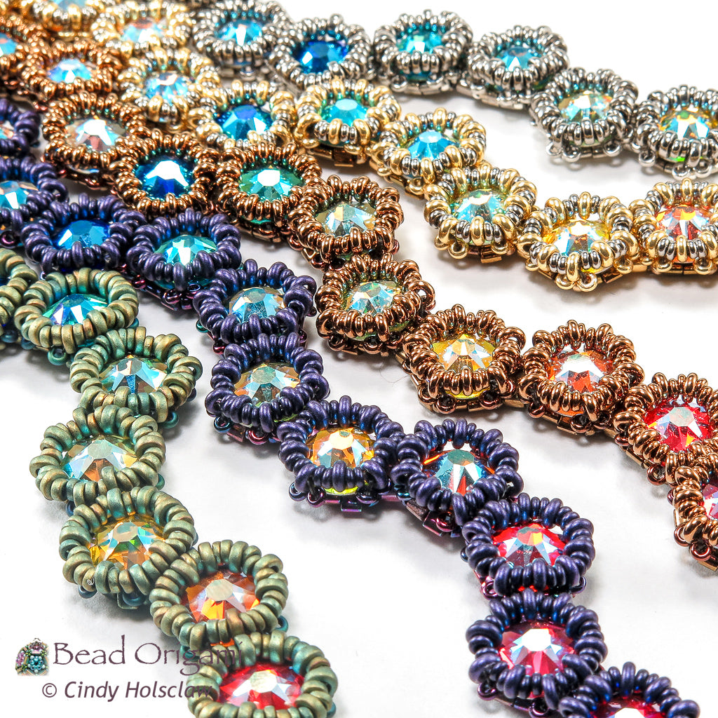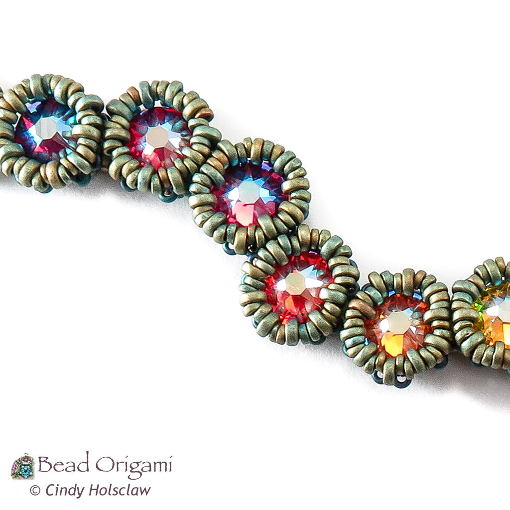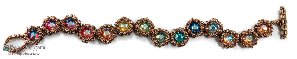Stitch an elegant bracelet with shimmering crystals! If you’re looking for a way to show off your favorite crystal colors, then this bracelet is for you. The Shimmer River bracelet features a winding rainbow of flatback crystals bezeled into place with Demi rounds or spacers. This easy design is perfect for showing off these thin seed beads, which come together to bezel the crystals in place without covering up their sparkle. Measuring only about a half inch wide (1.3 cm), the Shimmer River bracelet works up very quickly so you can make them in several different colors.