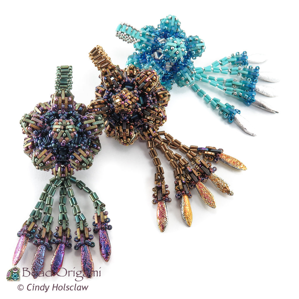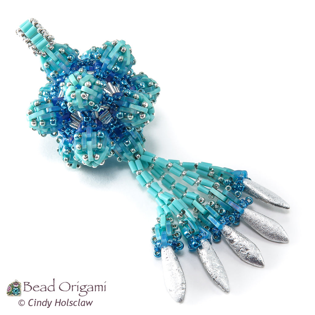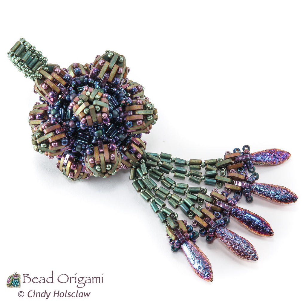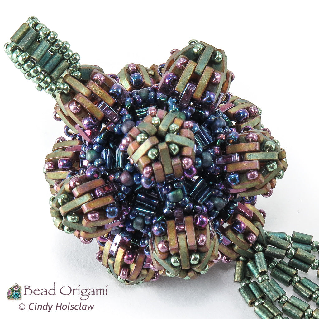 This pattern is appropriate for beaders who are already proficient in right-angle weave (RAW) and who would like the challenge of incorporating Quarter Tila beads into a 3D variation of this stitch. Beaders who have stitched the Succulent Topiary Pendant or the Fiberoptic Dodecahedron are in great shape to try this design.