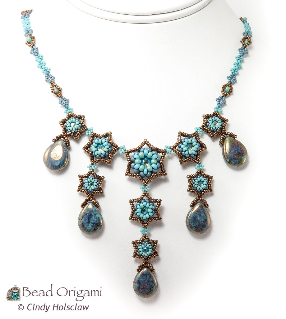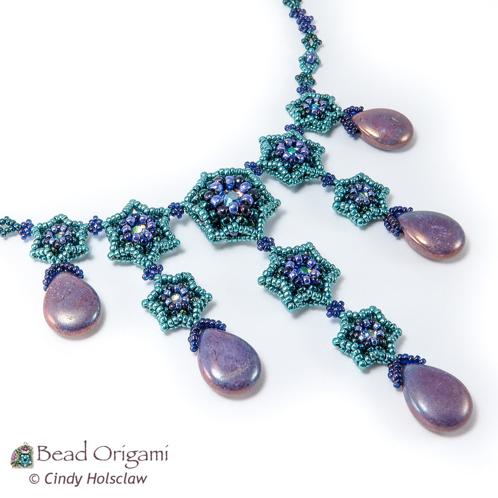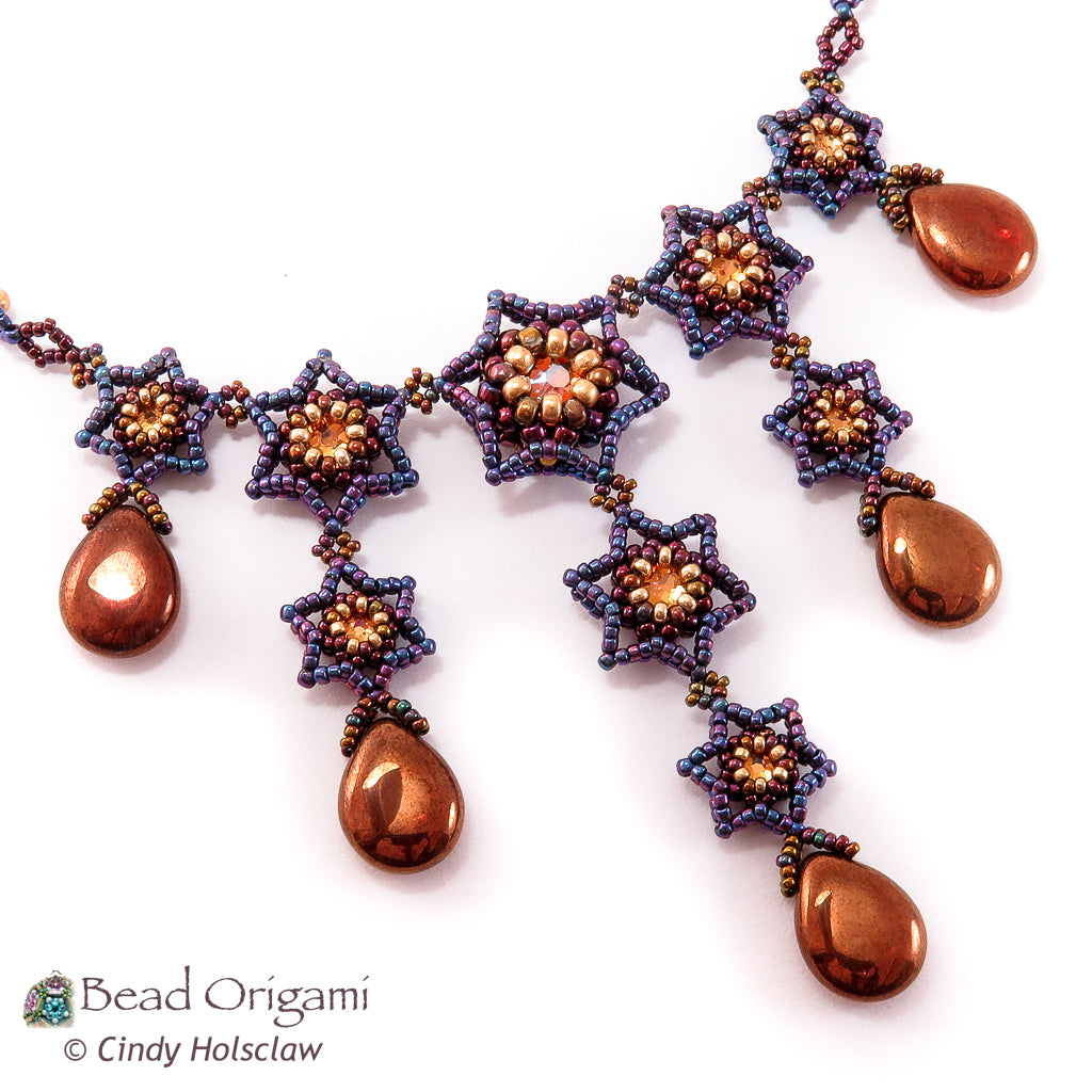 Stitch a constellation of beaded stars with double PRAW! Named after the northern sky constellation, the Cassiopeia necklace features three sizes of beaded stars paired with a collection of pear drops. You’ll use double prismatic right-angle weave (DPRAW)to bezel flat back crystals into the center of each star, and you’ll embellish them with a network of seed beads for simple yet effective star components. This necklace is fully reversible and offers ample opportunities for experimenting with different colors of seed beads. A delicate matching beaded chain completes this piece.