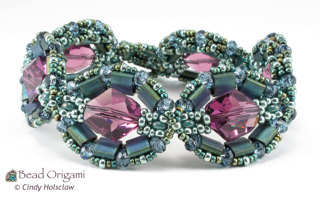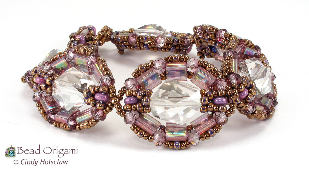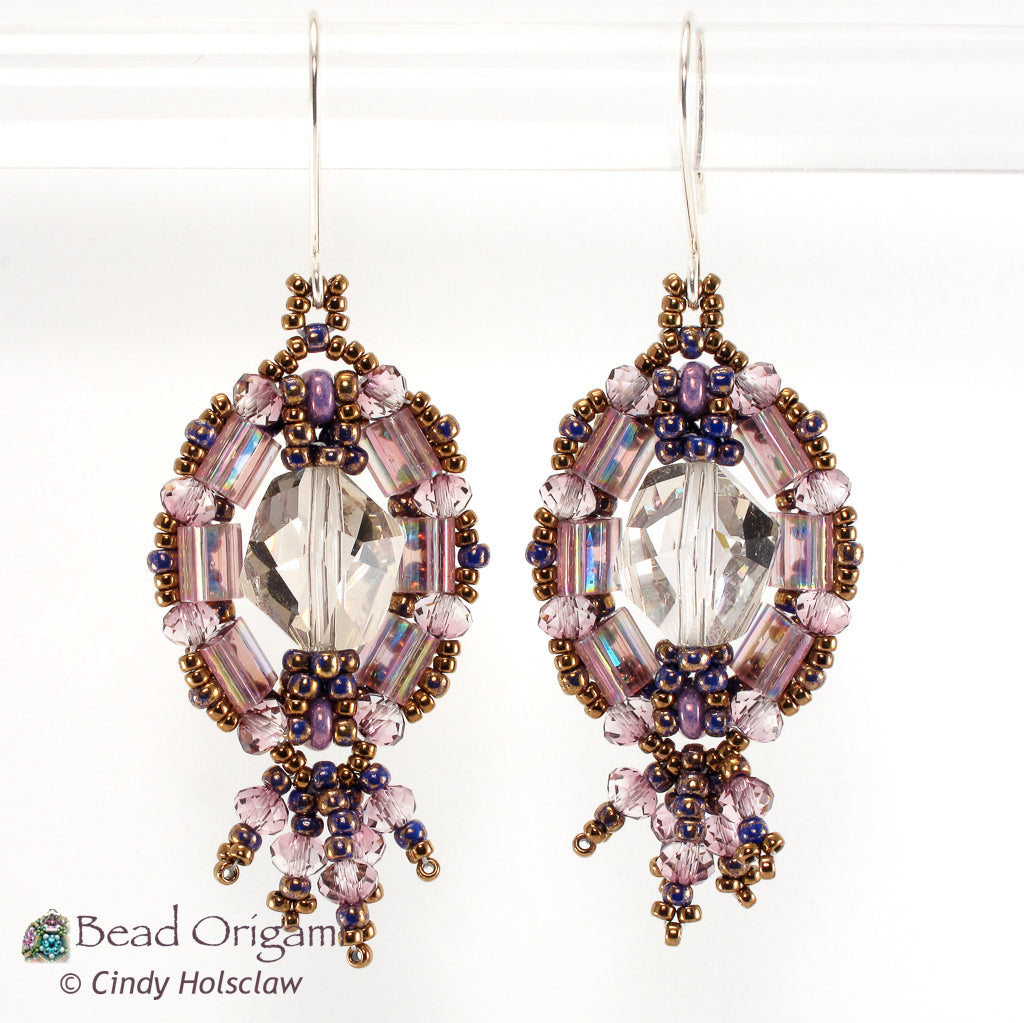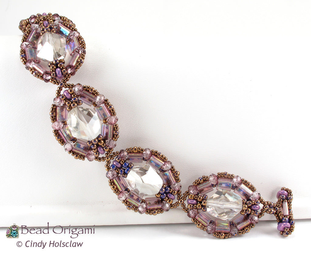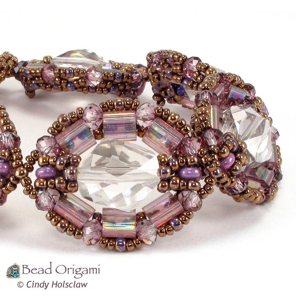 Frame a gorgeous, asymmetric "cosmic" Swarovski crystal with Miyuki Tila beads and roundelle crystals, and connect several of these oval-shaped components together for a beautiful bracelet. The Cosmic Windows component features a unique combination of crystals, round seed beads, and two-hole beads, and all of these beads are joined together into a self-supporting unit of beadwork. The bracelet is finished with a custom beaded toggle clasp, and the earrings are finished with sparkly fringe and a beaded bail. Connect even more of these unique components together for a matching pendant or a gorgeous necklace.