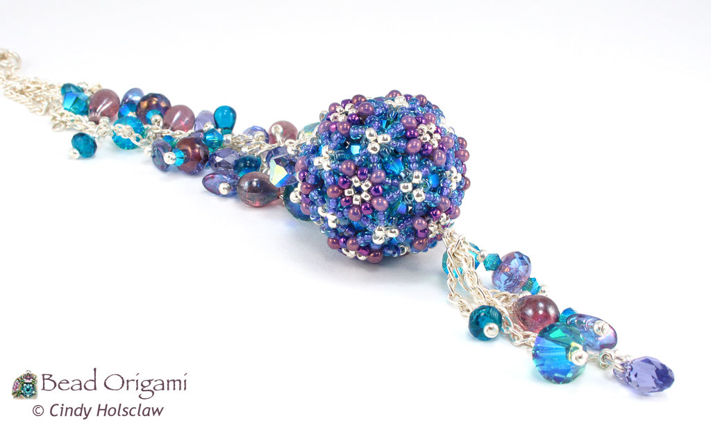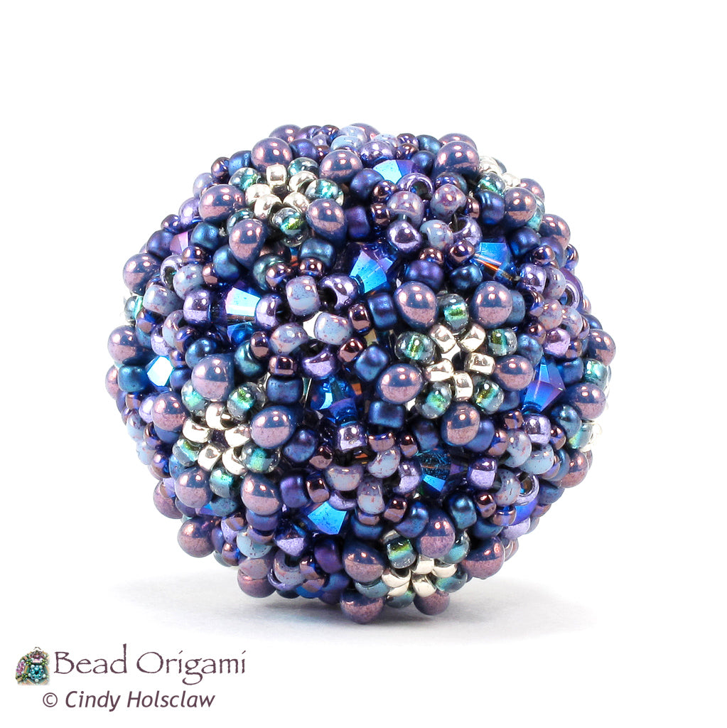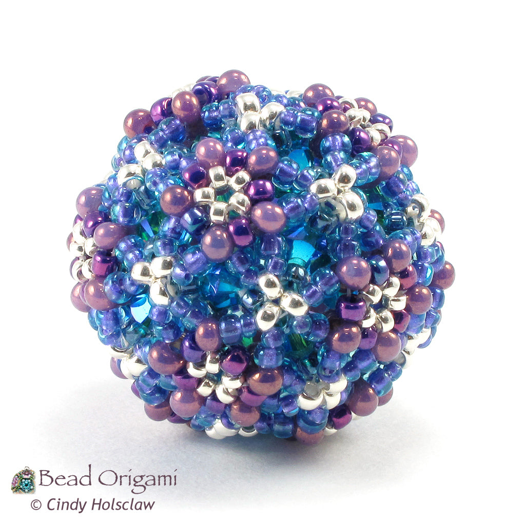 The Crystal Ball beaded bead is hollow and completely self-supporting ball of seed beads interspersed with sparkly crystals. Woven using the geometry of the dodecahedron, this design uses a variation of the right angle weave technique combined with the circular peyote stitch (check out my free Candy Dodecahedron pattern for an introduction to dodecahedron beaded beads). Use one beaded bead as a dazzling solo pendant or as a focal bead in a larger necklace. This design can also be made into a miniature beaded ornament.