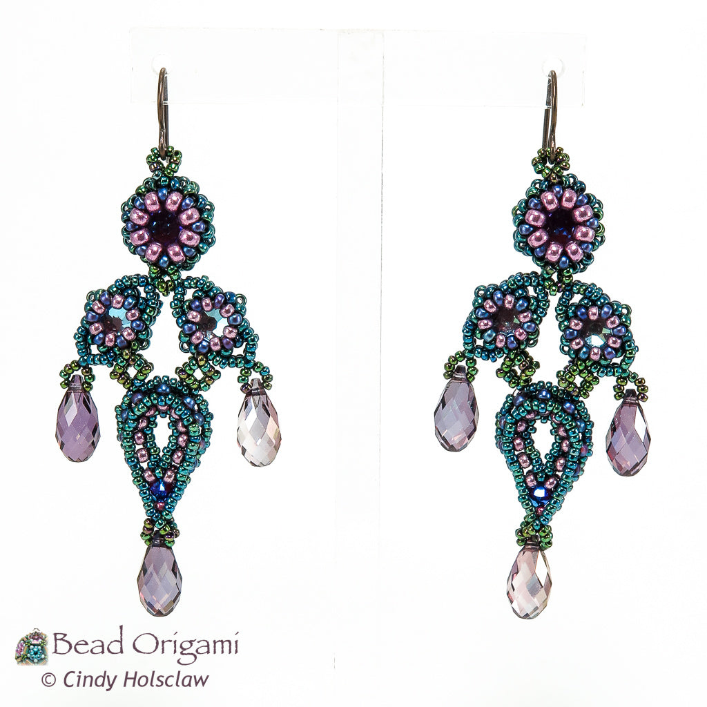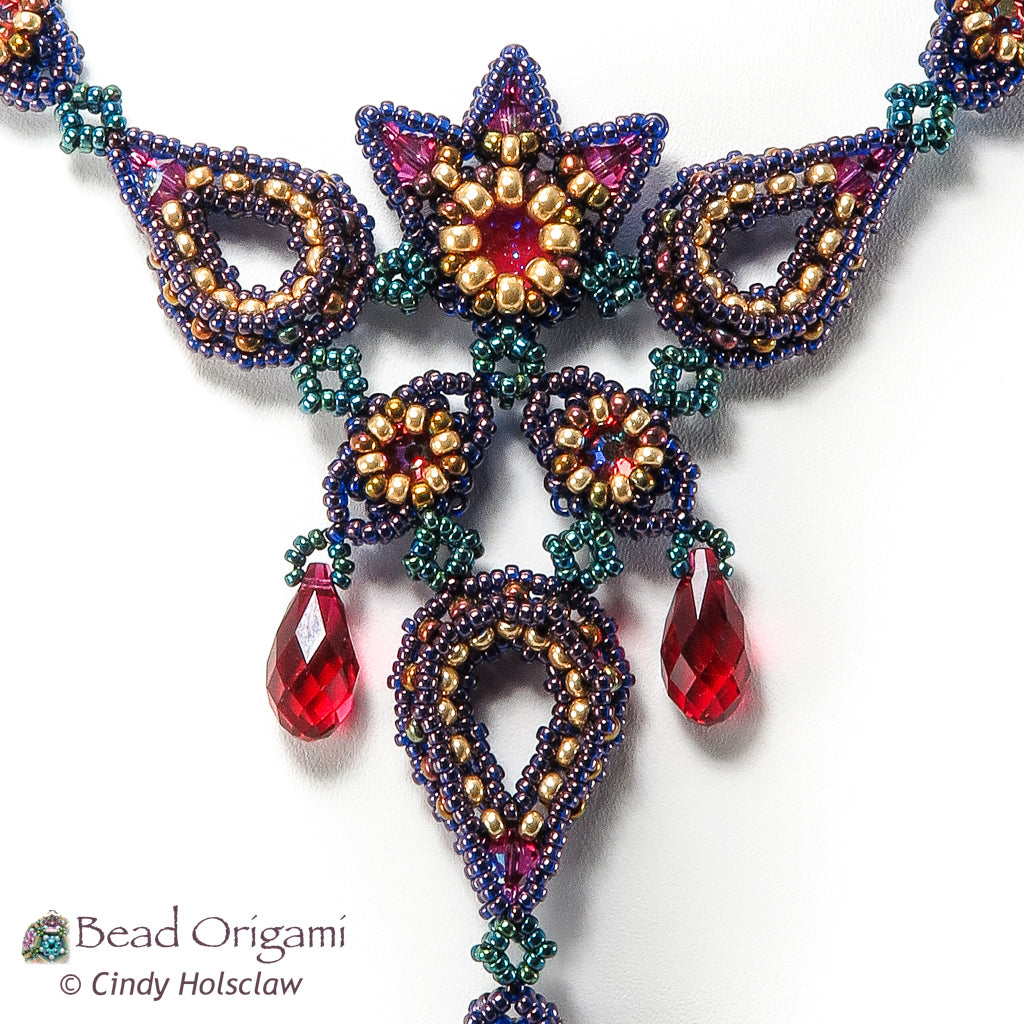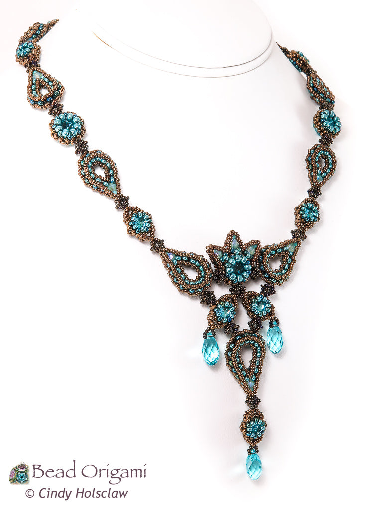 Weave a collection of droplets into this stunning necklace! The teardrop decorative motif represents the chemical water; a source of refreshment, a path to cleanliness, and an essential compound for all life as we know it. In this piece, several droplet elements come together from a diverse collection of structures and forms. Use cubic right-angle weave (CRAW) to stitch several droplet elements, bezel flat back crystals and chatons using double prismatic right-angle weave (DPRAW), and complete the necklace with teardrop-shaped Swarovski crystals. You can explore mixing and matching these components for earrings, bracelets, and more.