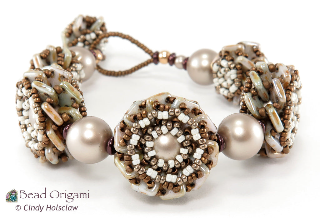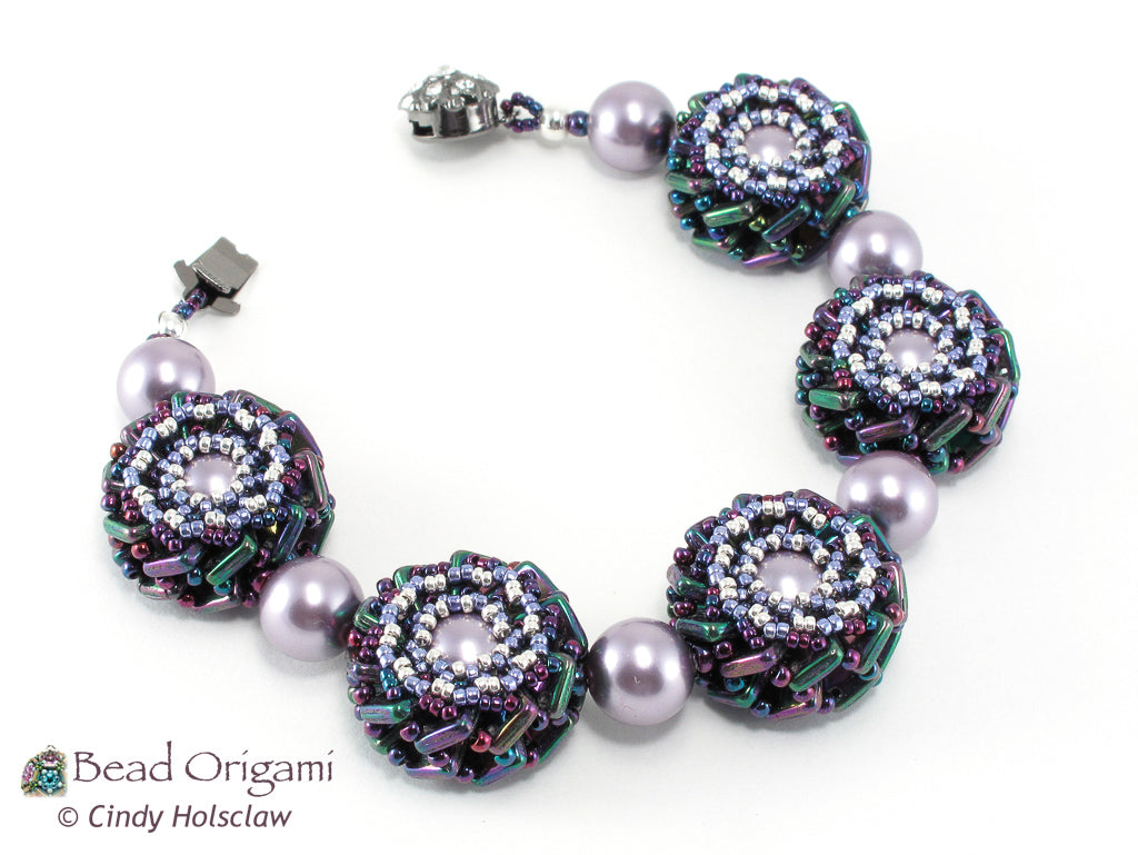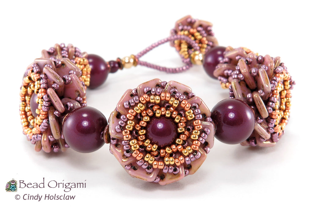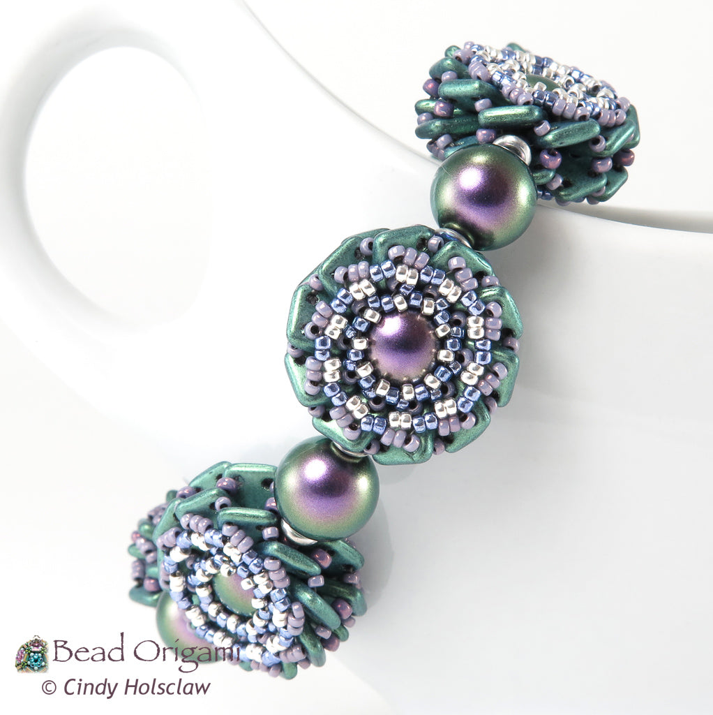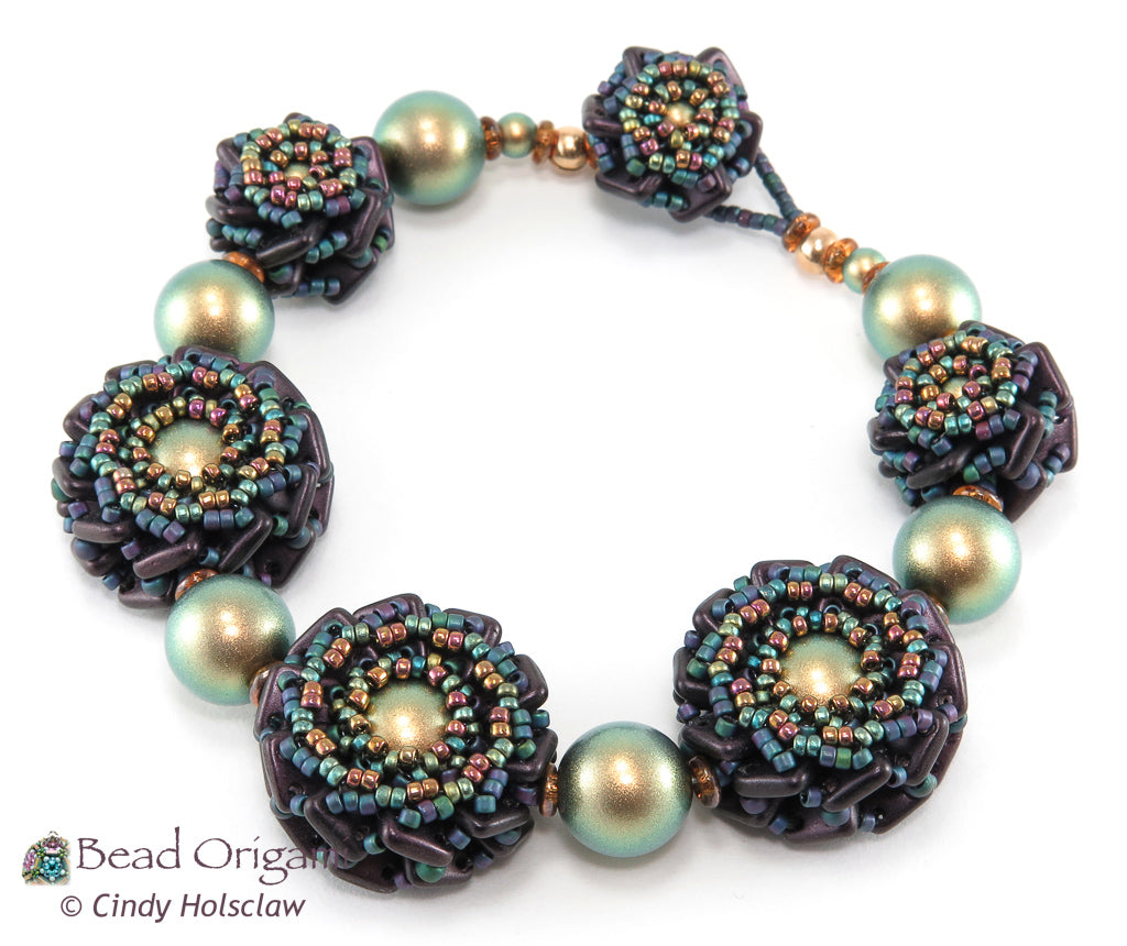 This pattern describes how to make two different sizes of Double Rosette beaded beads, as well as the matching clasp, and how to string these beads together to create an elegant bracelet. This pattern is appropriate for experienced beaders who are ready to take up the challenge of working with four-hole QuadraTile beads. Beaders who have mastered the Double Pinwheel beaded beads are in great shape to try out this design. Use these beaded beads in matching necklaces, earrings, or as individual charms!