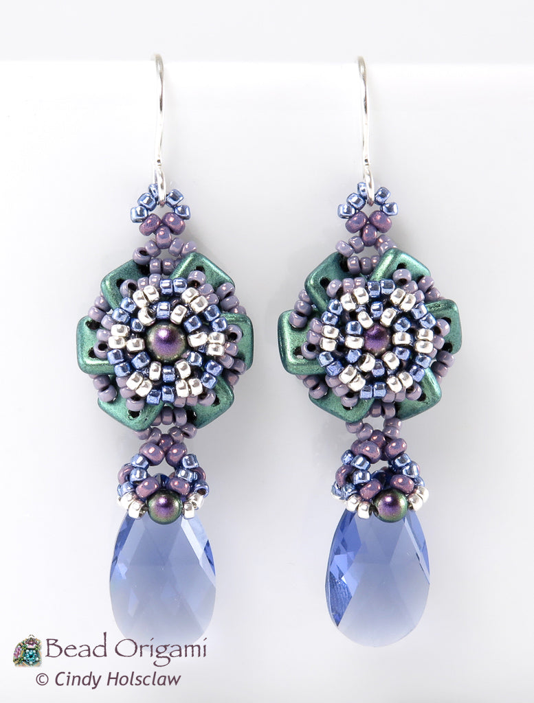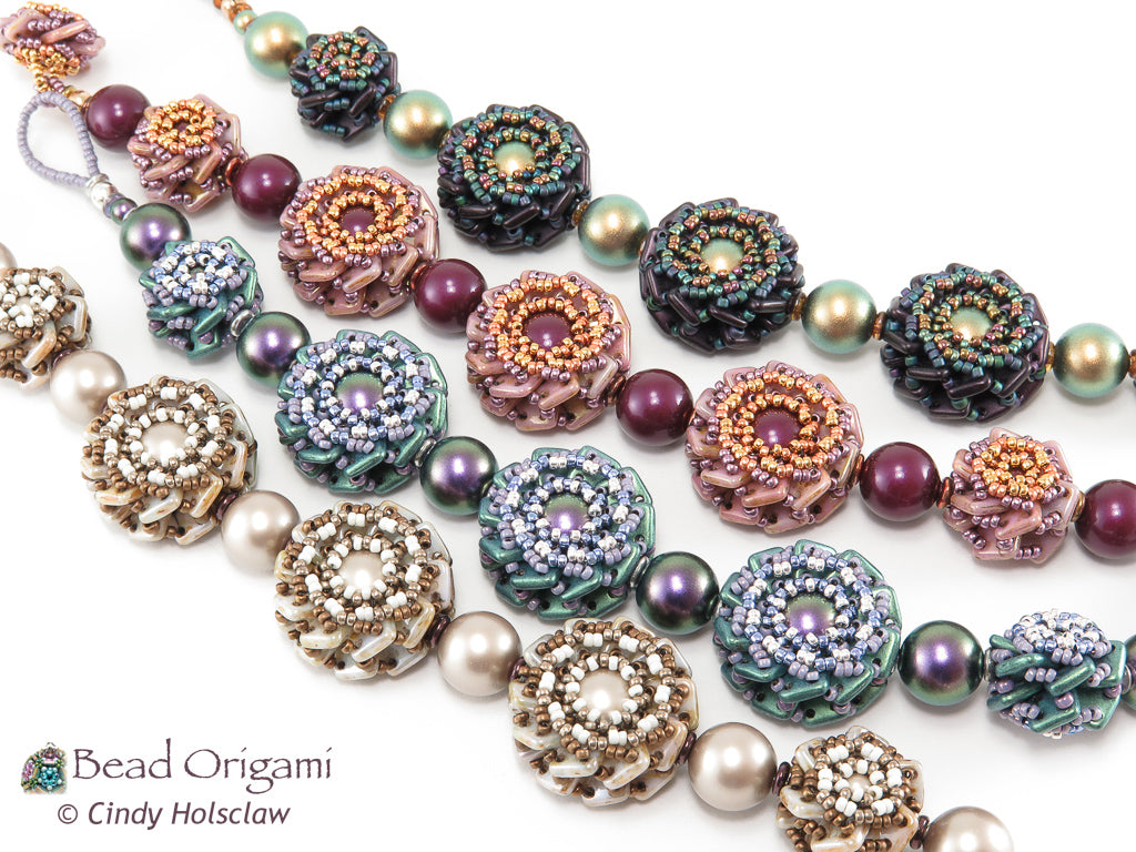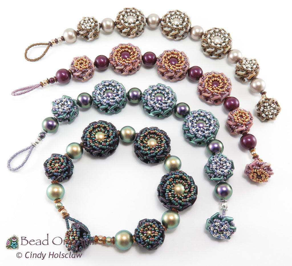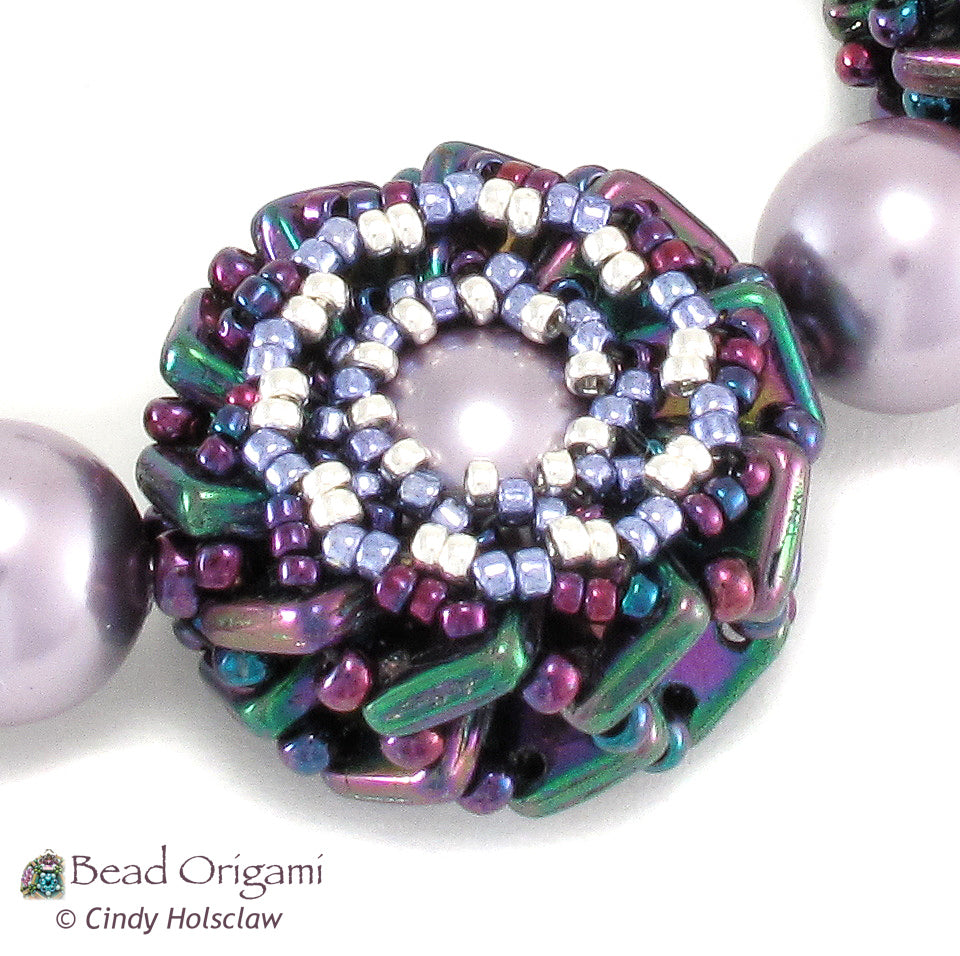 This pattern describes how to make two different sizes of Double Rosette beaded beads, as well as the matching clasp, and how to string these beads together to create an elegant bracelet. This pattern is appropriate for experienced beaders who are ready to take up the challenge of working with four-hole QuadraTile beads. Beaders who have mastered the Double Pinwheel beaded beads are in great shape to try out this design. Use these beaded beads in matching necklaces, earrings, or as individual charms!