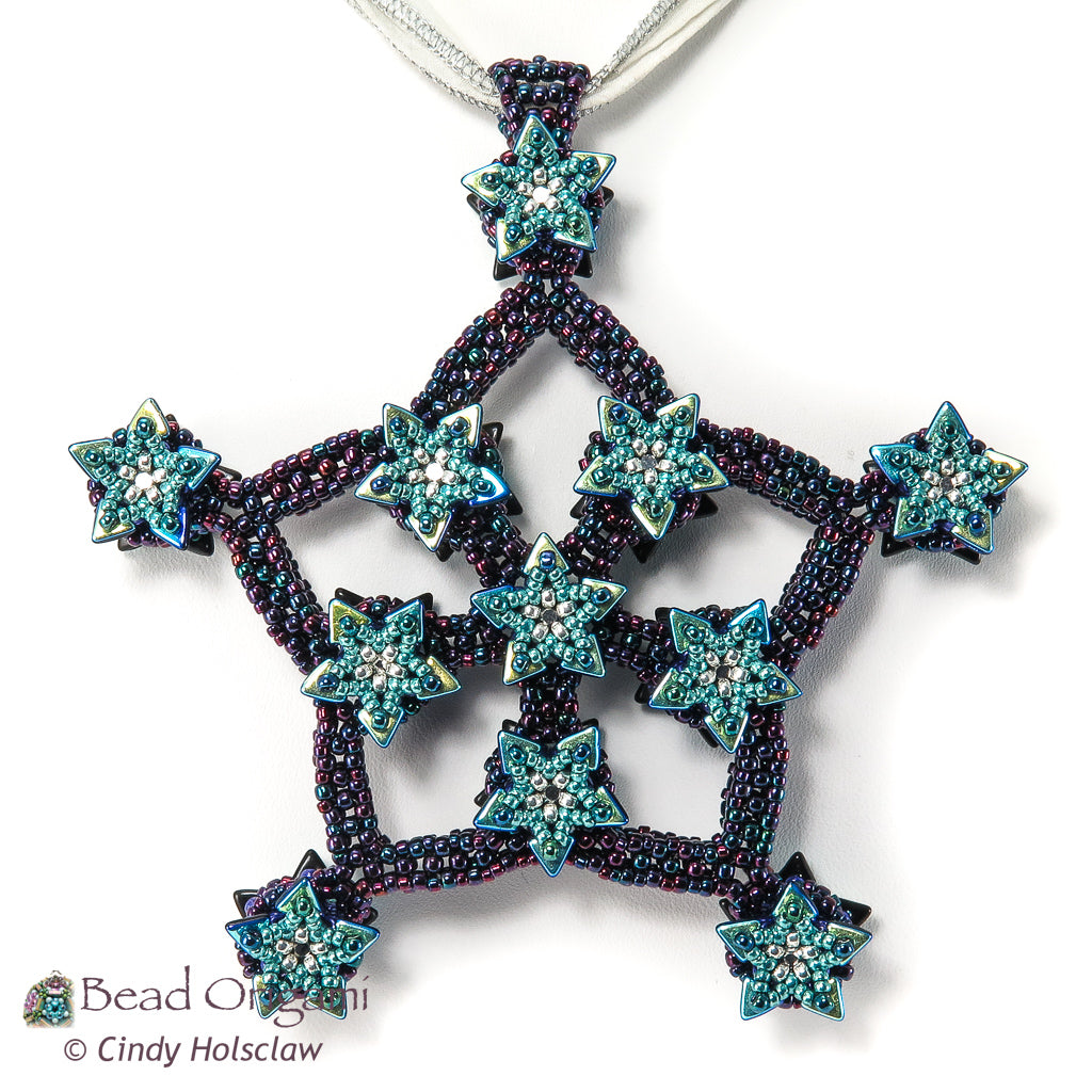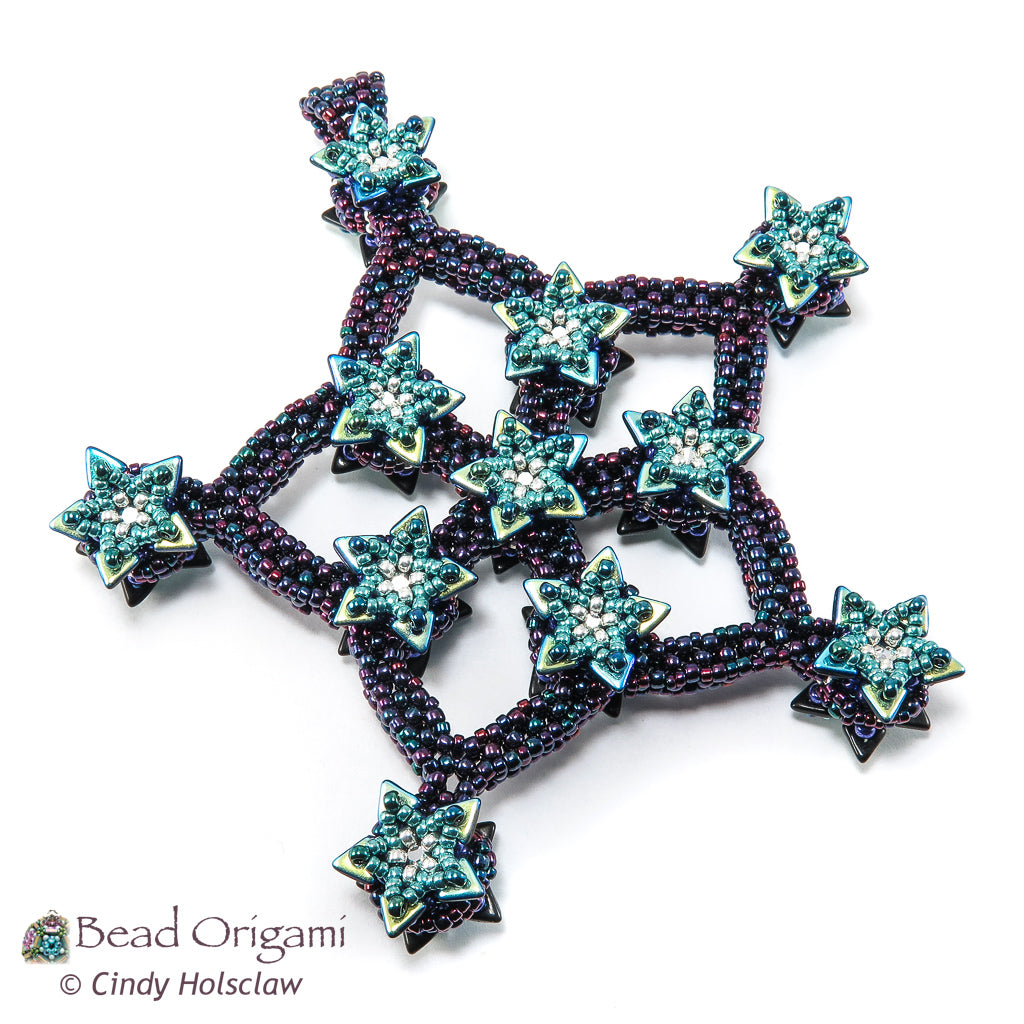Stitch a sky full of stars! The Full of Stars pendant features delicate beaded stars in a large, ornament-sized structure. You’ll use double prismatic right-angle weave (DPRAW) to bezel sparkly flat-back crystals into the center of each star, and embellish them with pointy Tri beads. Connect the stars together with several units of cubic right-angle weave (CRAW), and finish the design with a simple but functional bail. This pendant is fully reversible and offers many opportunities for experimenting with a rainbow of bead colors. Wear it as a statement pendant, or hang it as an ornament!