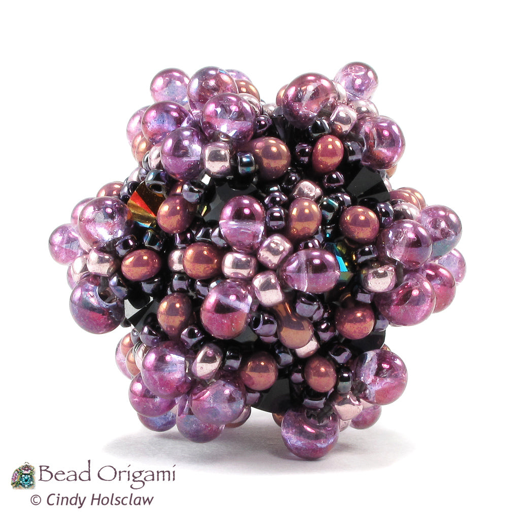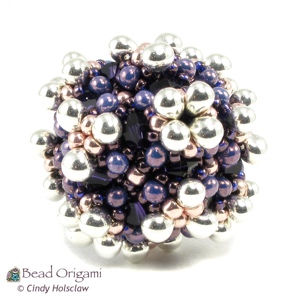 The Microphyte beaded bead resembles a colony of tiny cells, and gets its name from a diverse group of microscopic plants. However, despite its organic look, this beaded bead is built using a defined underlying symmetry. This structure uses the geometry of a cuboctahedron to combine bicone crystals, drop seed beads, peanut-shaped seed beads, and Japanese round seed beads together for an eclectic collection of textures all woven into one beaded bead. The Microphyte beaded bead is an excellent size for a solo pendant or as a focal in a larger necklace.