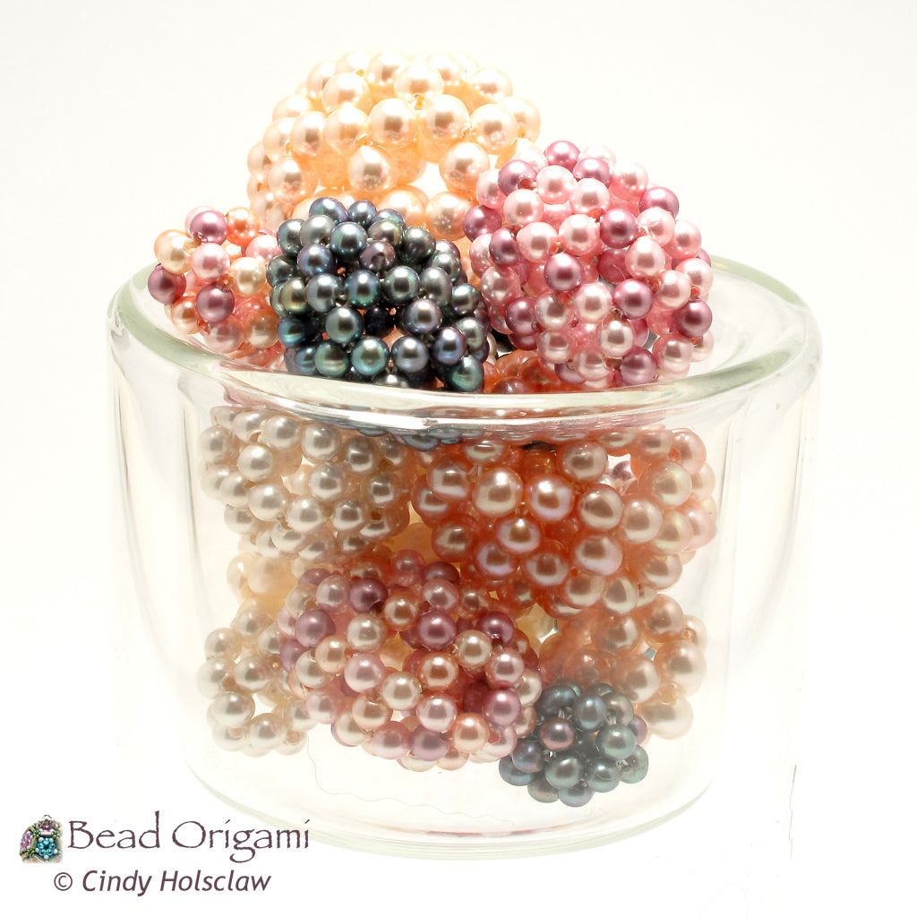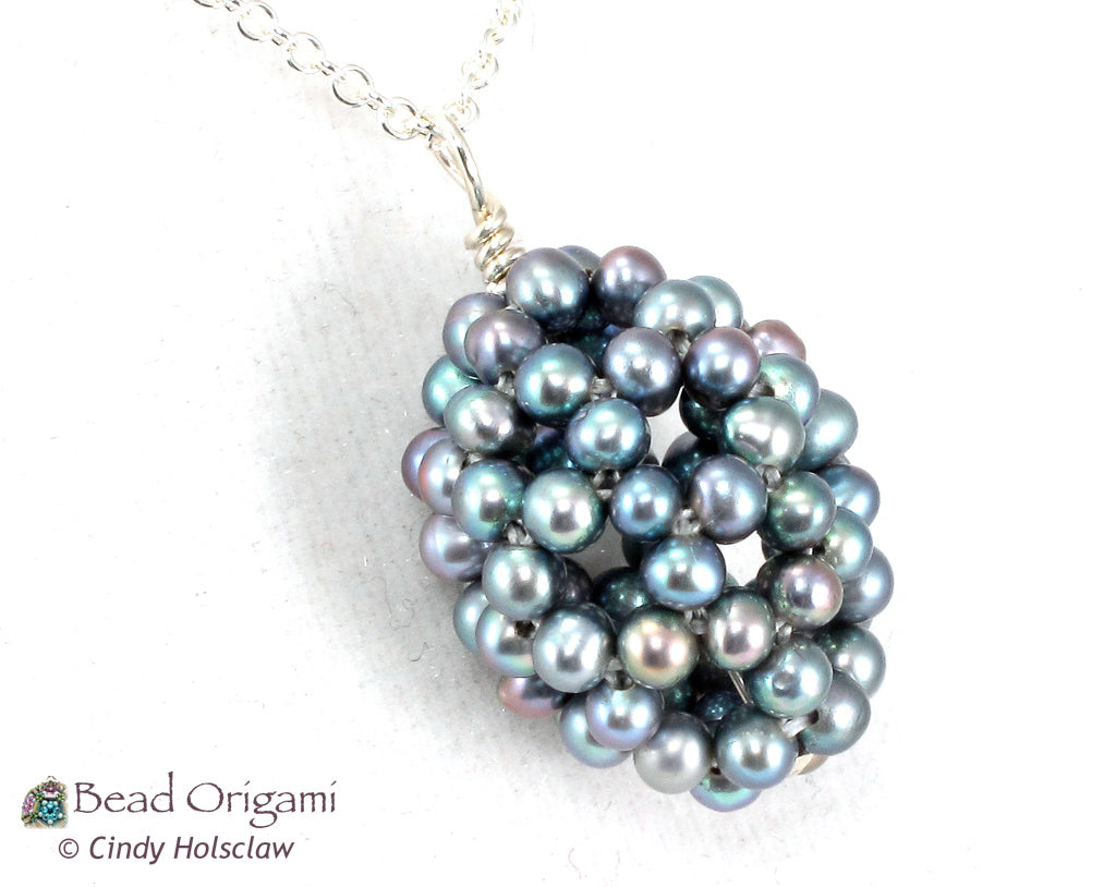 The Plum Egg beaded bead is an egg-shaped cluster woven using a technique similar to right angle weave. Inspired by the origami of Rona Gurkewitz and Bennett Arnstein, this beaded bead is in the shape of a truncated hexadecahedron; a polyhedron that contains 16 hexagons, eight pentagons, and two squares. This design is an ideal size for a beaded pendant, and its holes are large enough so that it can be strung through a narrow cord. Weave one of these eggs to celebrate Easter in the springtime, or weave it in the fall to mark the start of the American football season.