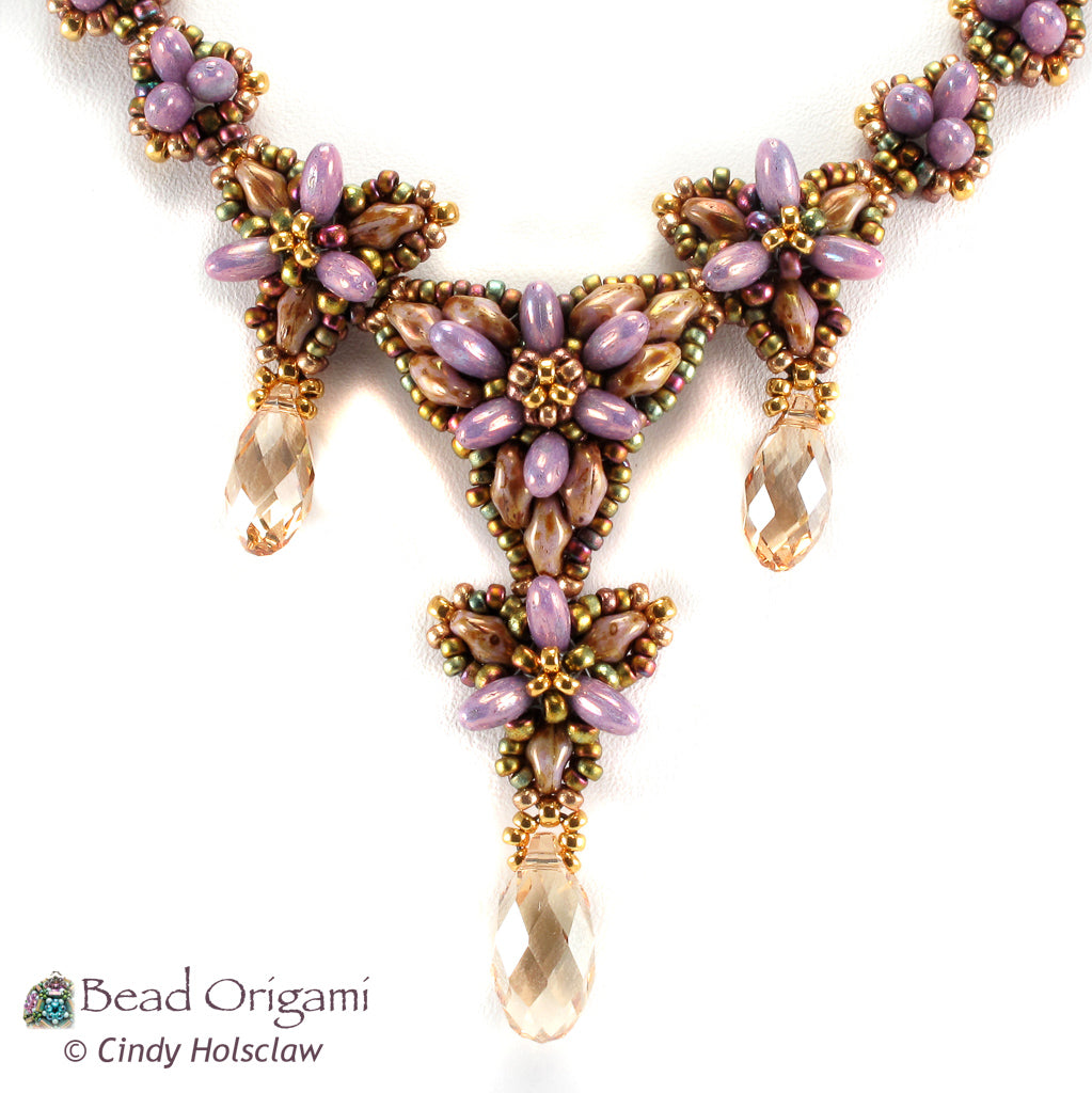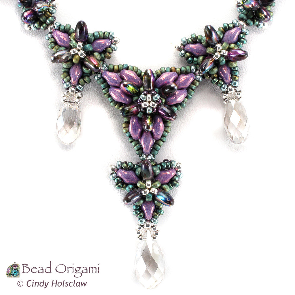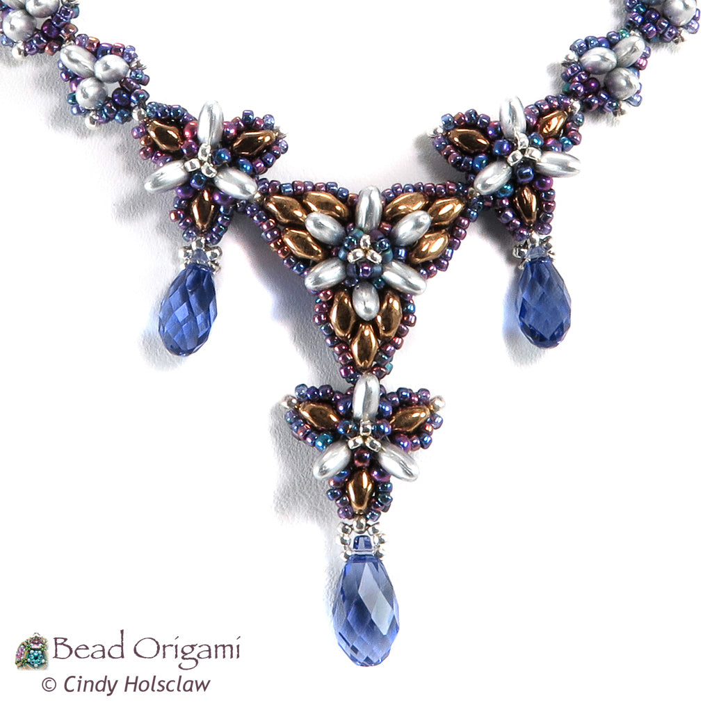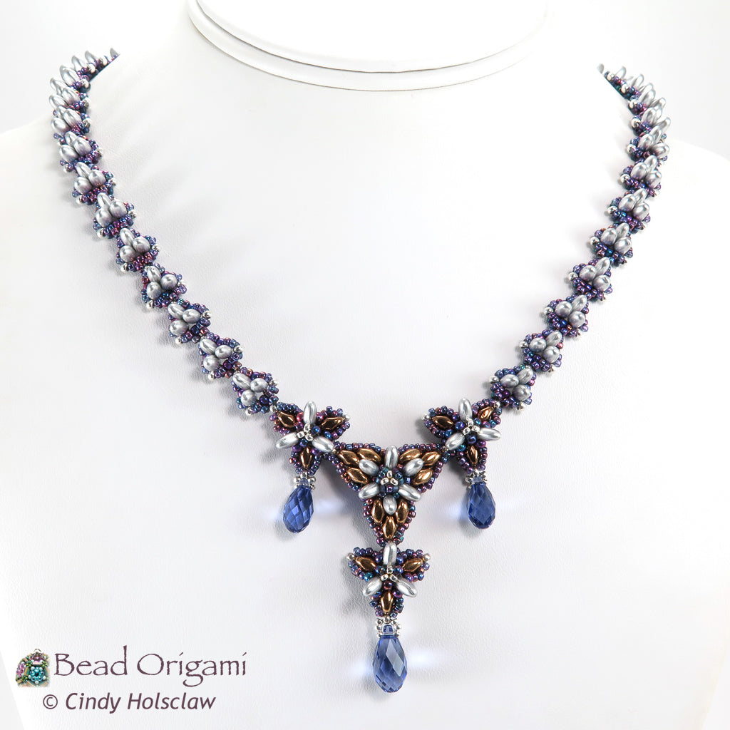Combine two modern bead shapes together in a classic, elegant necklace. This piece features both the rice-shaped Rizo beads and the two-hole SuperDuo beads, woven together with Japanese seed beads into two triangular components that form the focal point of this necklace. A matching beaded rope and a custom clasp complete the necklace. Each component of this necklace can also be adapted into many other kinds of jewelry such as earrings, bracelets, and pendants!