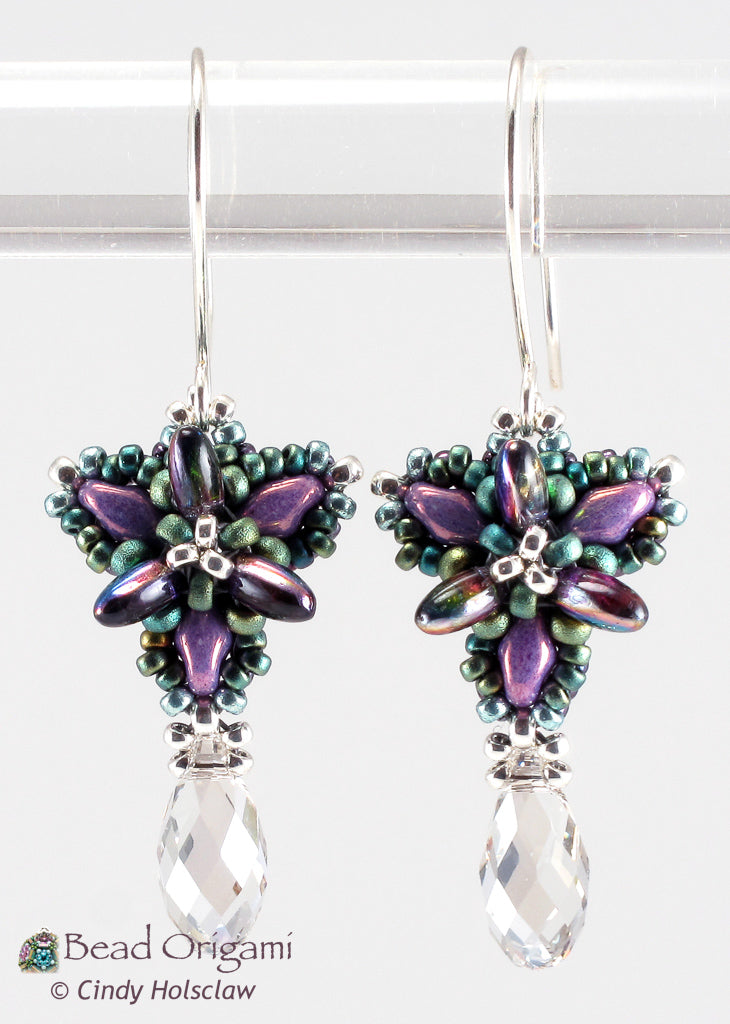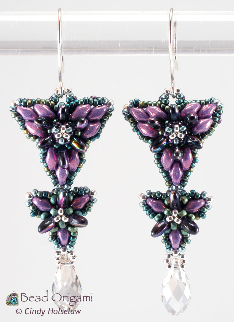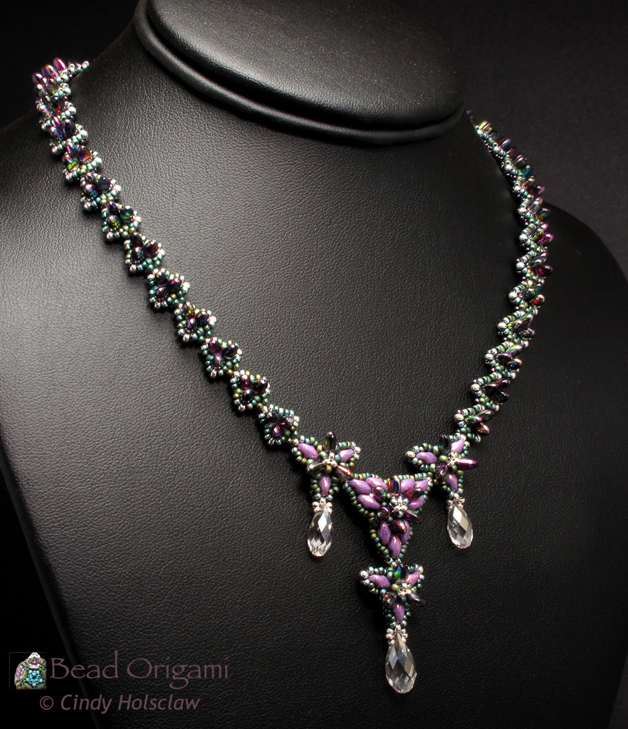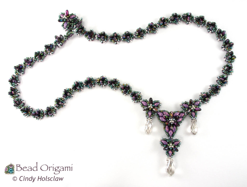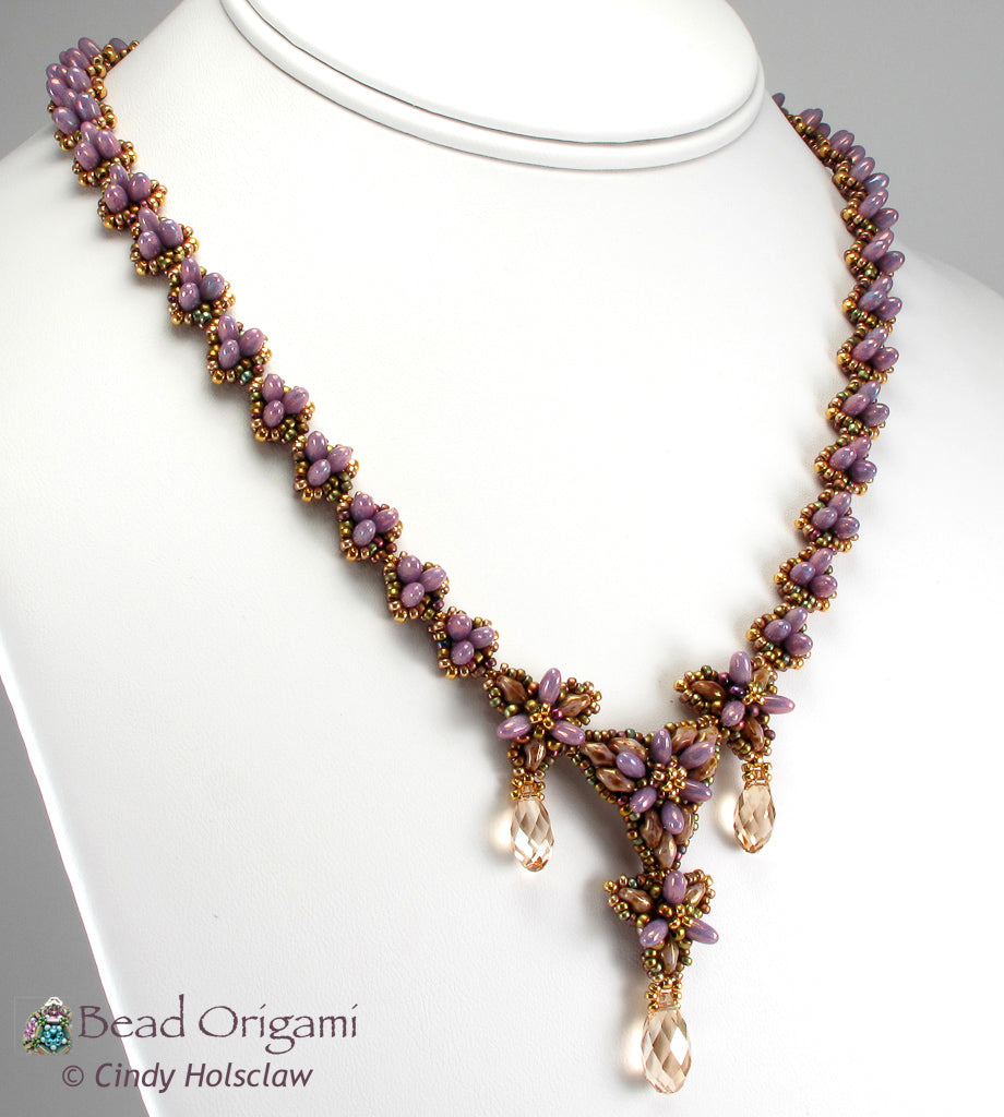 Combine two modern bead shapes together in a classic, elegant necklace. This piece features both the rice-shaped Rizo beads and the two-hole SuperDuo beads, woven together with Japanese seed beads into two triangular components that form the focal point of this necklace. A matching beaded rope and a custom clasp complete the necklace. Each component of this necklace can also be adapted into many other kinds of jewelry such as earrings, bracelets, and pendants!