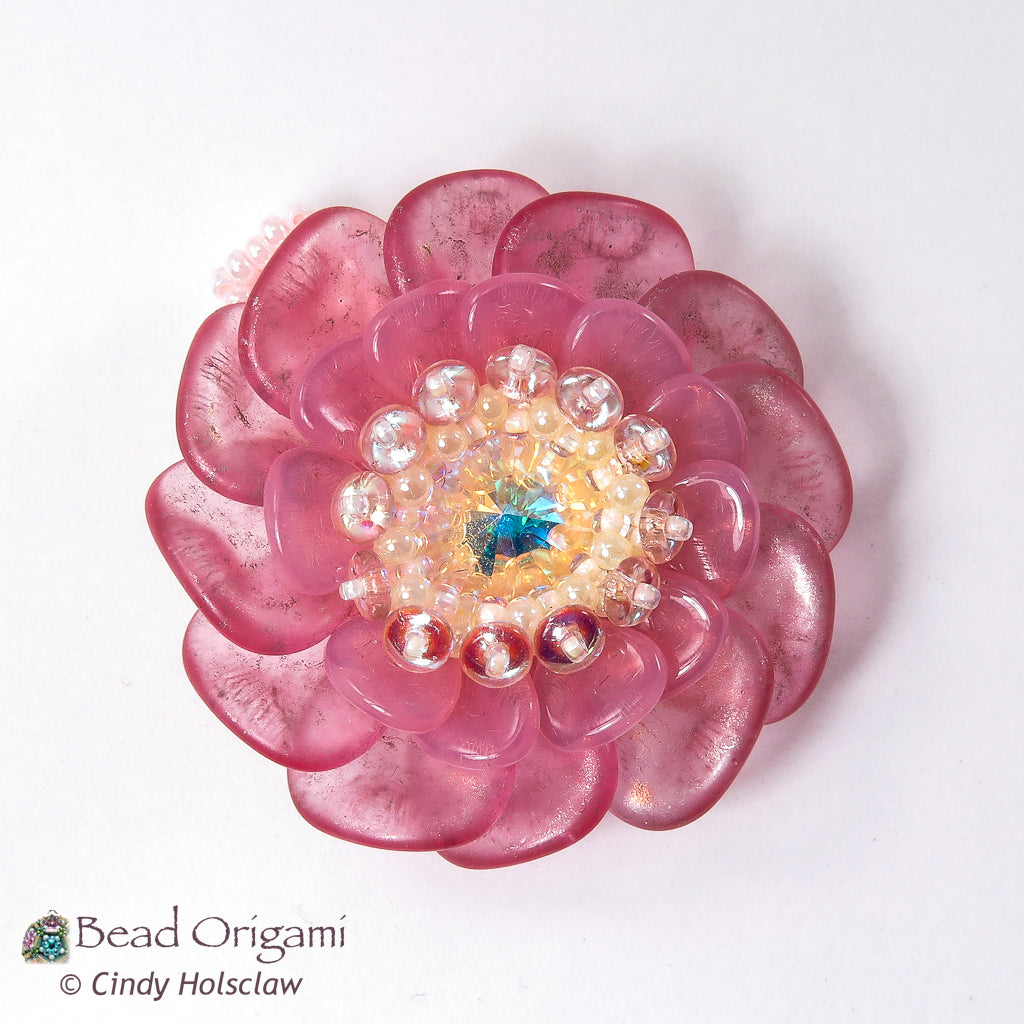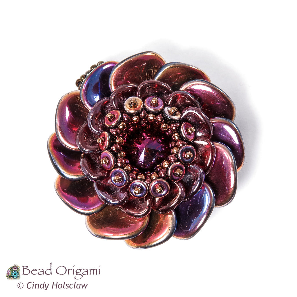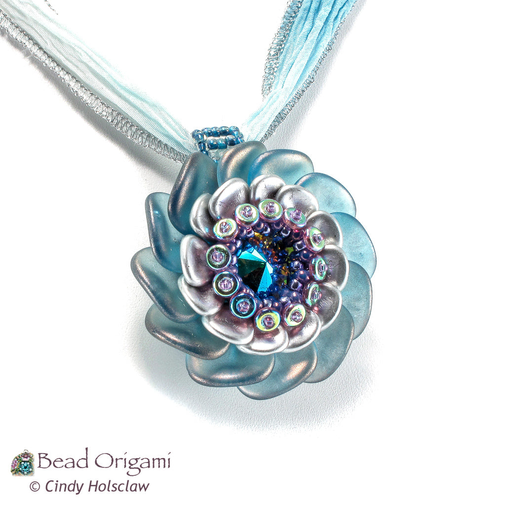Weave a blooming beaded pendant using two different sizes of petal beads! The Rose Blossom Pendant uses variations on the circular peyote and right angle weave stitches. Two layers of petal beads and an embellishment of O beads surround a central rivoli crystal in this sparkly pendant. String one pendant on a silk ribbon, or combine several into one piece of beadwork for a gorgeous statement necklace.
