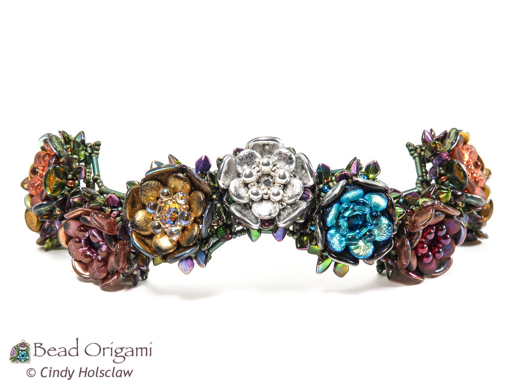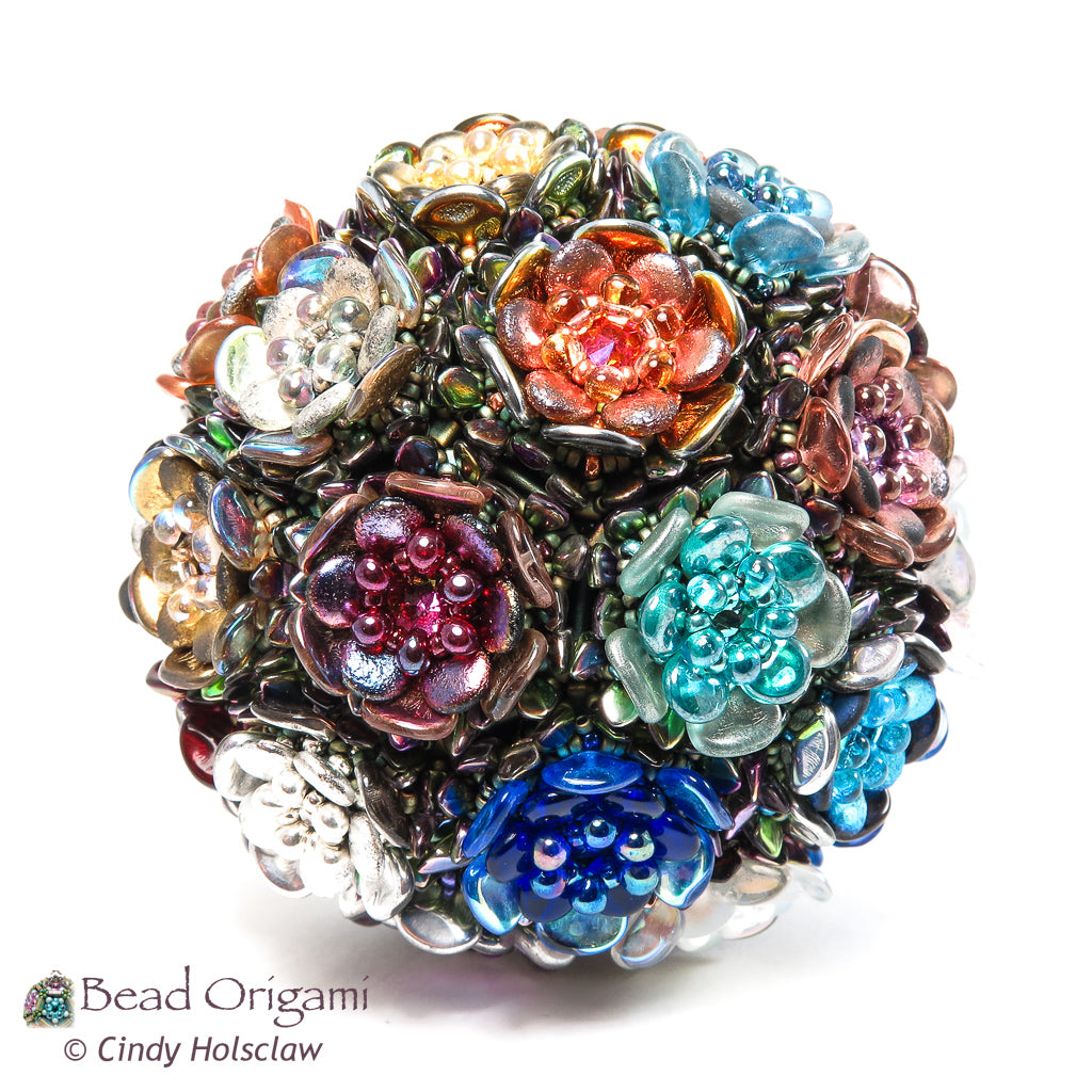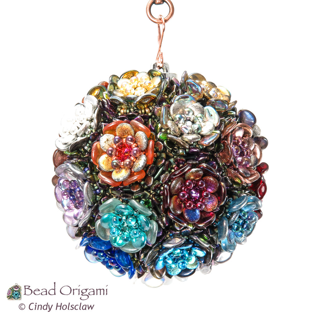Stitch an heirloom ornament covered with beaded roses! Originally designed for the 2024 Bead Origami Advent Box, this showstopper ornament is versatile enough to decorate your living space all year long. To stitch it, you’ll cover a round ornament with a collection of flowers woven with shaped beads, seed beads, and crystals. The finished ornament measures about 3.5 inches (8.9 cm) in diameter and fits in perfectly on a festive holiday tree, but I display it with the rest of my beaded spheres throughout the year. If you like the geometric look of the Terrarium or the Kepler's Harmonies Spheres, this is a great project to add to your collection.