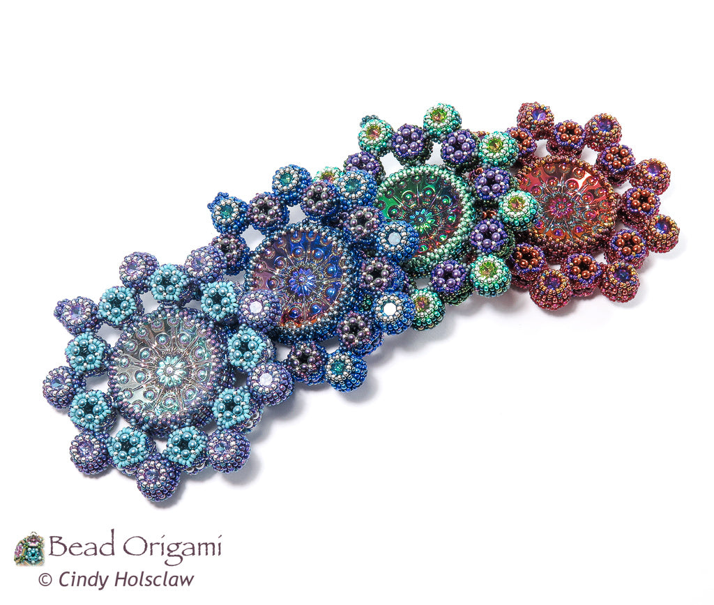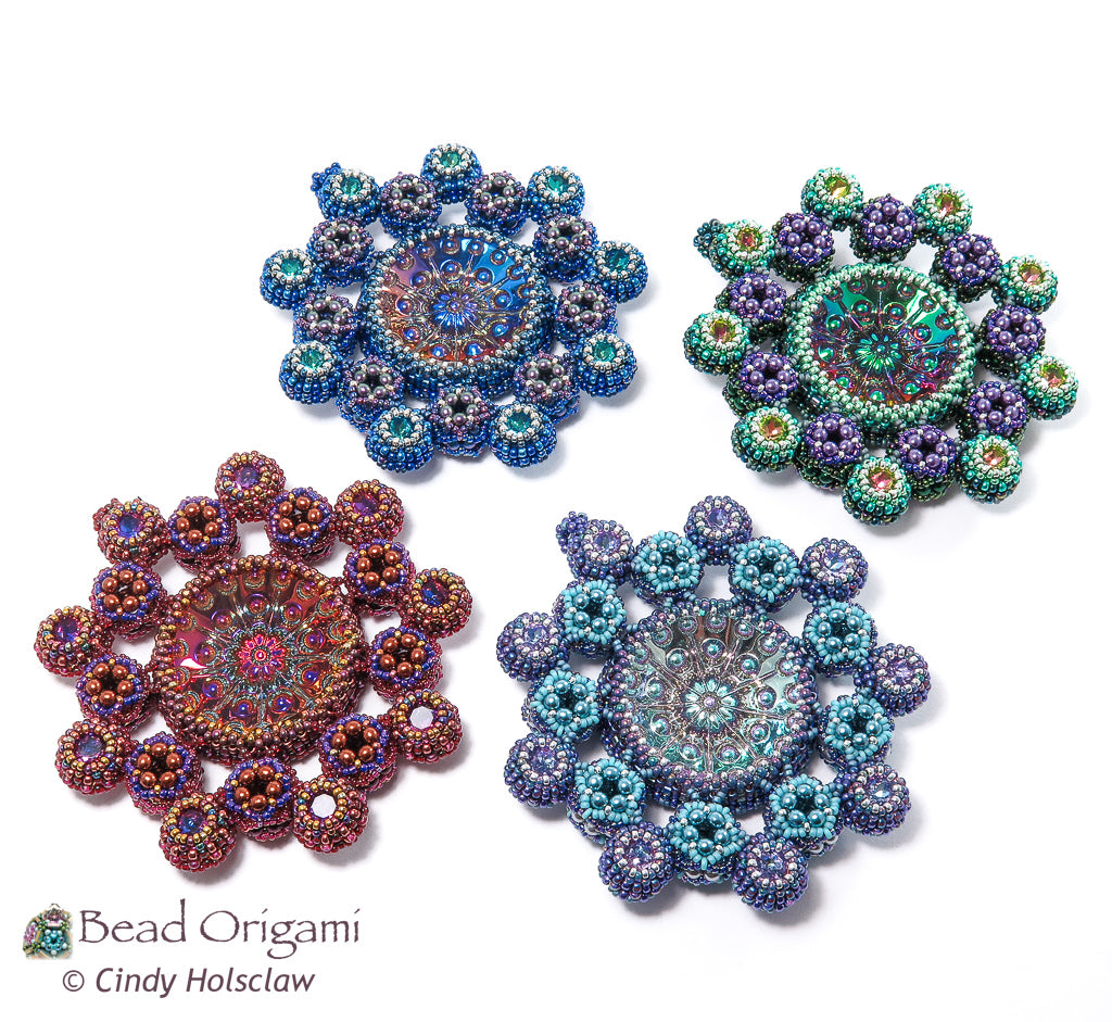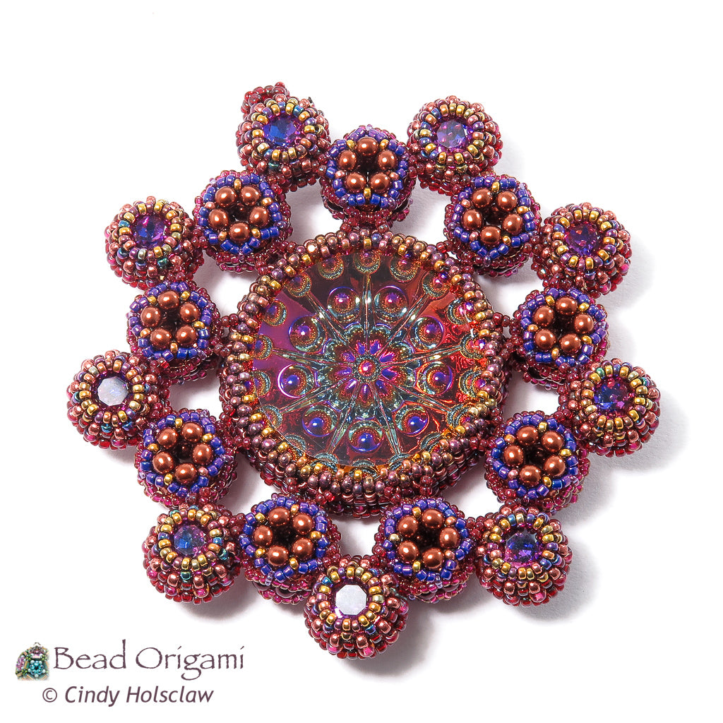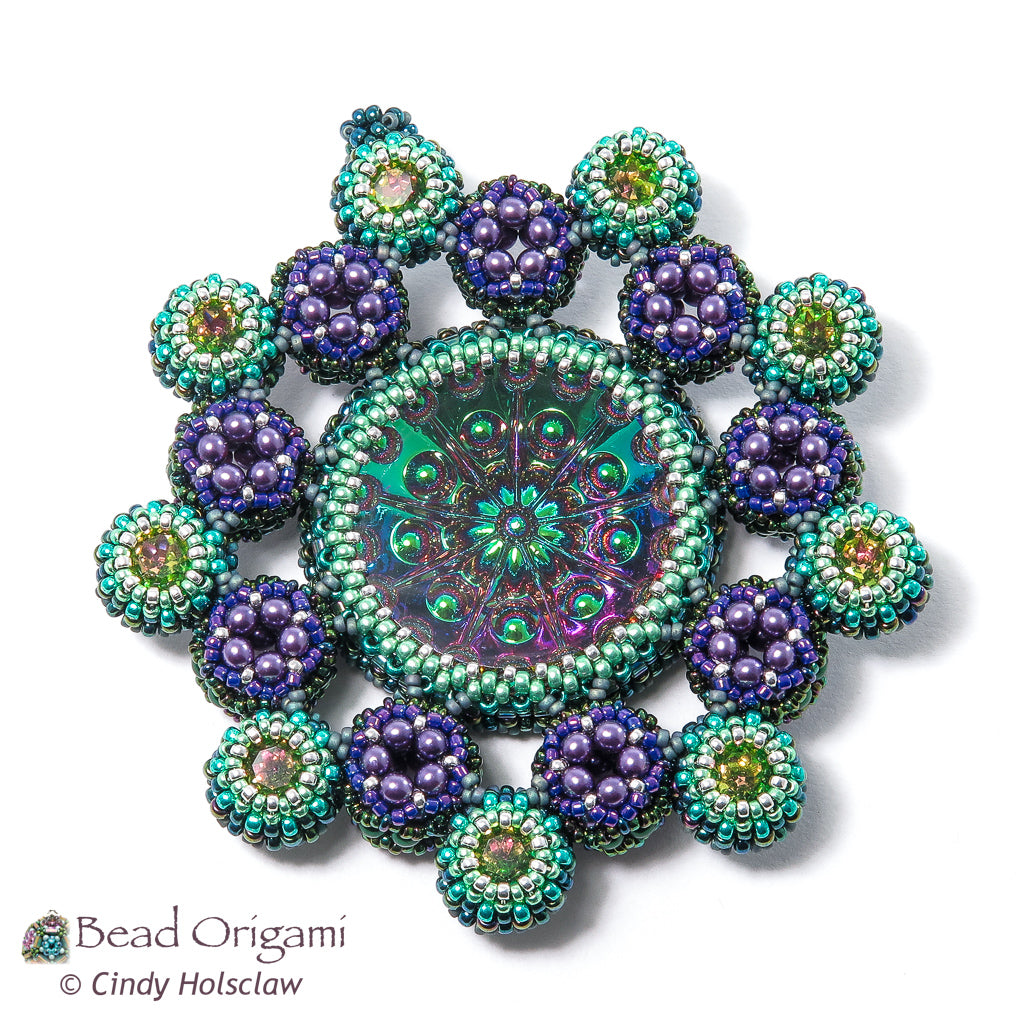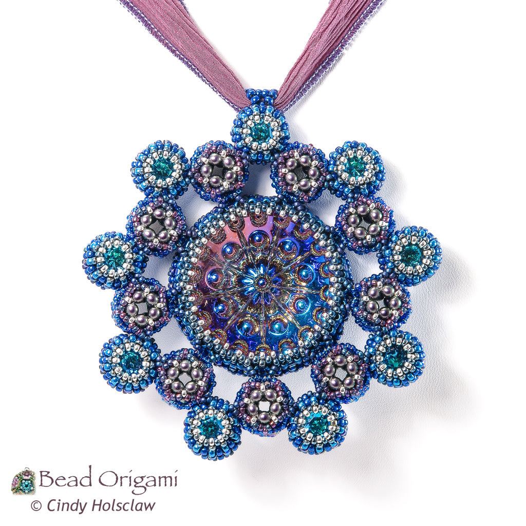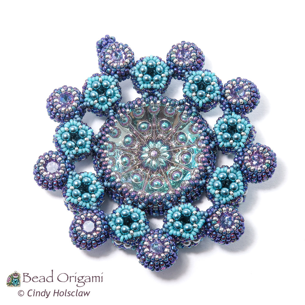 Show off a stunning cabochon! The Satellites Pendant features a large glass doublet cabochon with a rosette of little round bubbles. Embellished dodecahedrons and matching crystals orbit the cabochon and mimic its rosette pattern. Use prismatic right-angle weave (PRAW) and modified right-angle weave (MRAW) to bezel the cab and the crystals, and weave a variation of cubic-right angle weave (CRAW) to stitch the dodecahedrons. Wear your finished pendant on your favorite rope or ribbon, or hang it on your tree for a sparkly addition to a festive holiday!