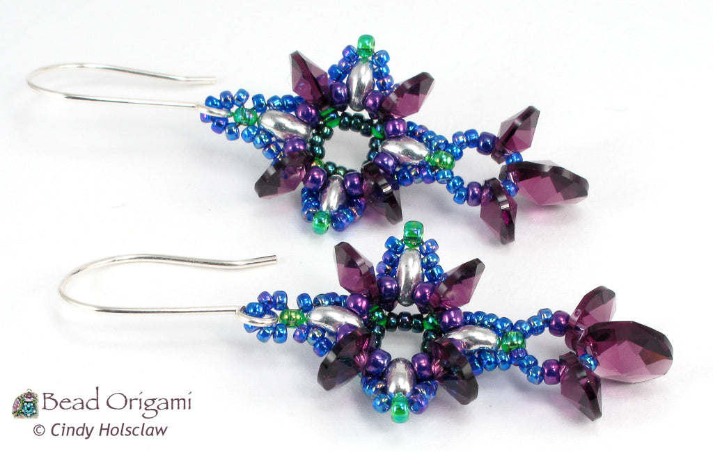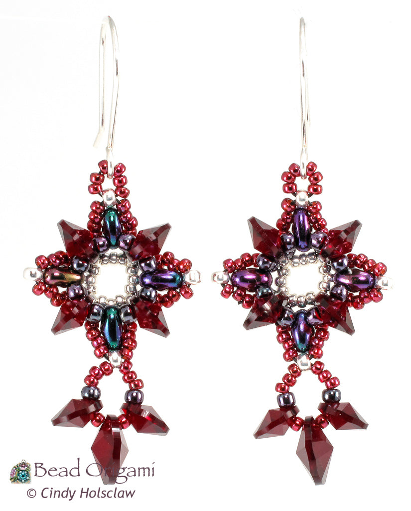 The Squareflake Earrings feature two-hole Czech beads such as Twin or SuperDuo beads, along with sparkly rivoli pendant crystals, and are woven together in a snowflake-shaped beaded component. The tension of the thread used in this modified circular peyote design keeps the rivoli crystals securely in place. These earrings are so fun and easy to make that you'll want to weave a pair to match every outfit!