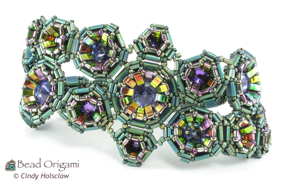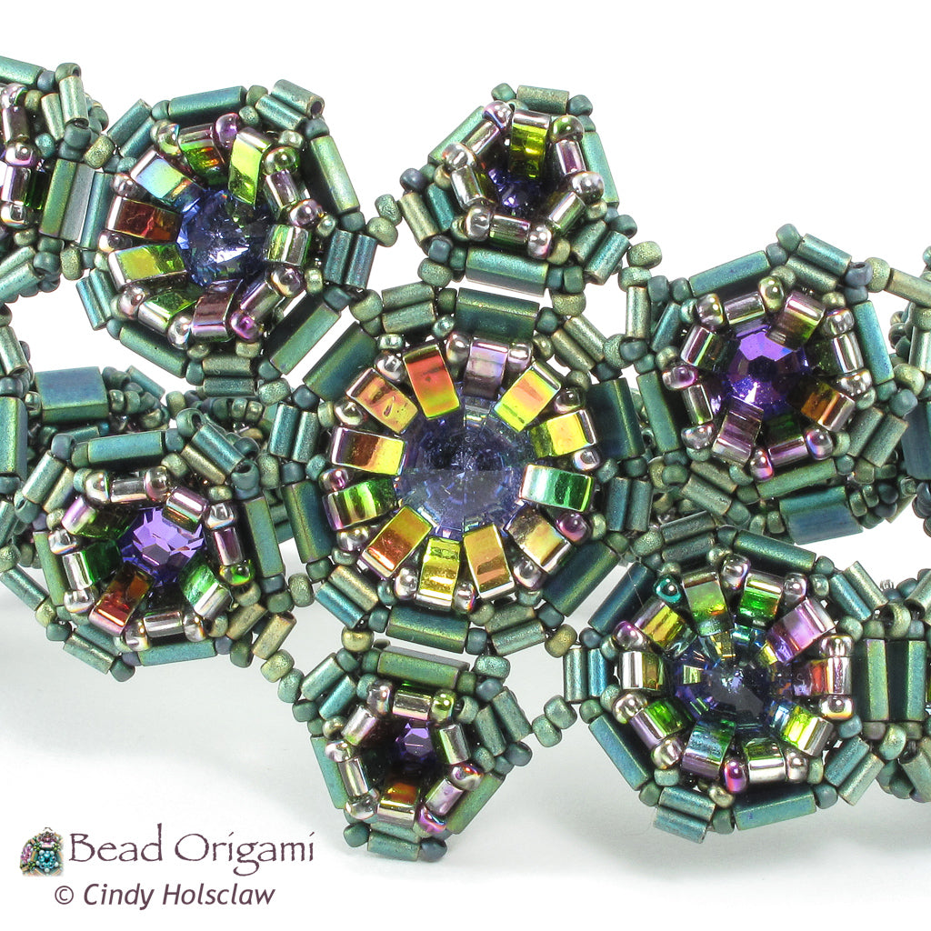 Create a sparkly bracelet out of a collection of angular geometric elements! The Stepping Stones bracelet features four different shapes of geometric components that use a combination of Tila, Half Tila, and bugle beads to frame sparkly rivoli crystals. Connect the individual components together in a complex but symmetric arrangement for an intricate bracelet, or experiment with your own arrangements for completely different looks.