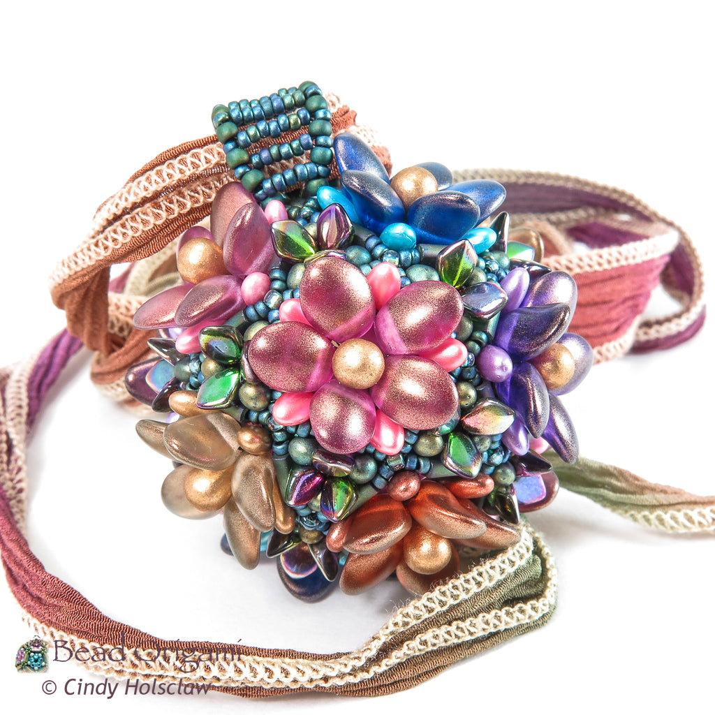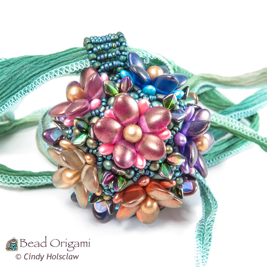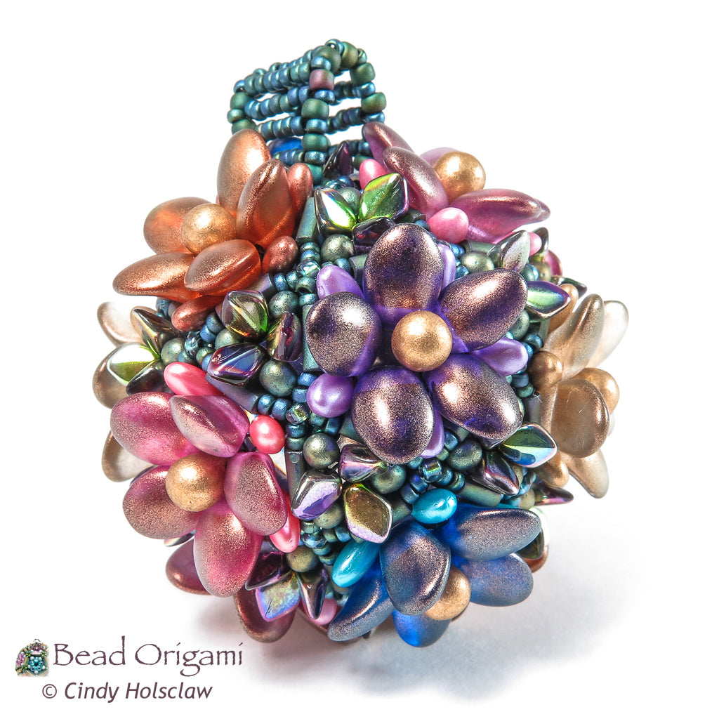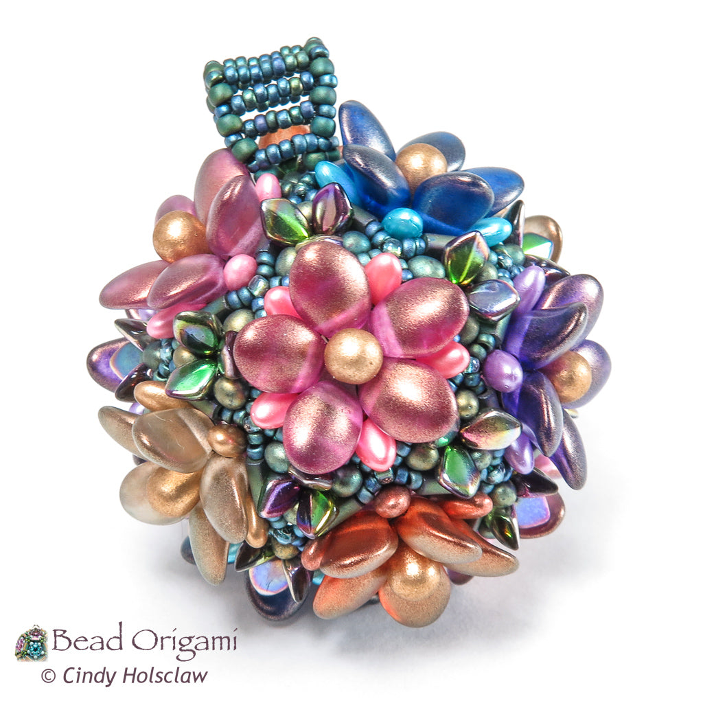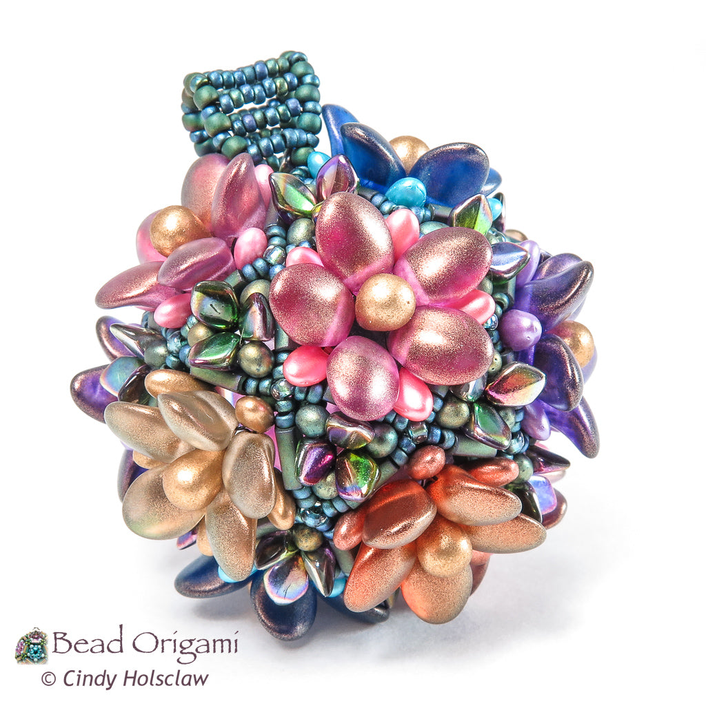 Stitch a beaded topiary with shaped beads! The Succulent Topiary Pendant features a diverse collection of Japanese and Czech shaped beads that join together to create a floral pendant. This clever design follows the geometry of an icosidodecahedron; a close relative of dodecahedron with room for 12 flowers surrounded by 20 bits of beaded greenery. The pattern explains how to weave the flowers in an even color distribution so that no two flowers of the same color sit next to each other. Measuring over 1.75 in (45mm) in diameter, this hefty pendant makes quite the statement!