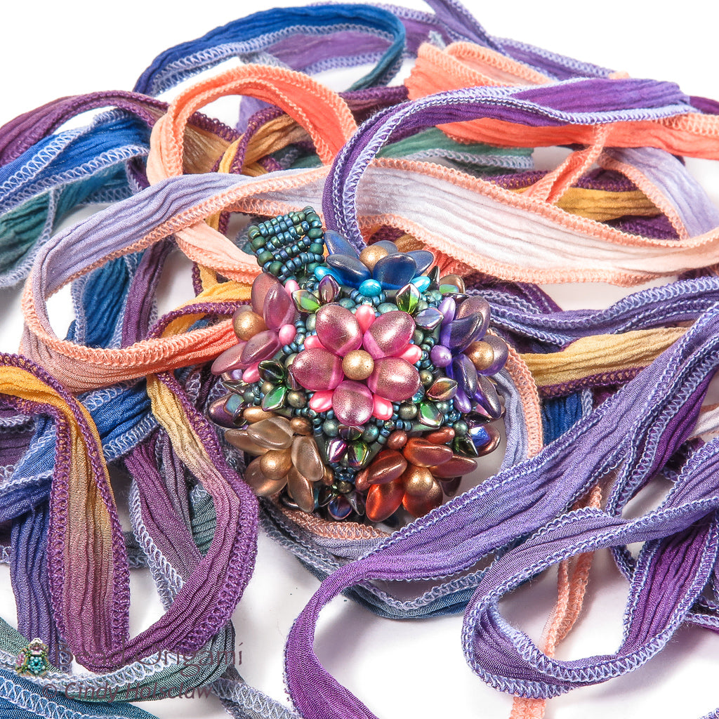 The Matte Shimmer Pendant plus Purple and Friends ribbon kit includes everything you need to stitch the pendant, plus a silk ribbon picked from the colors shown.