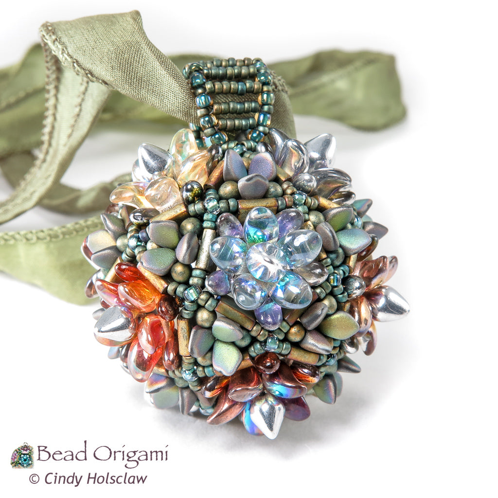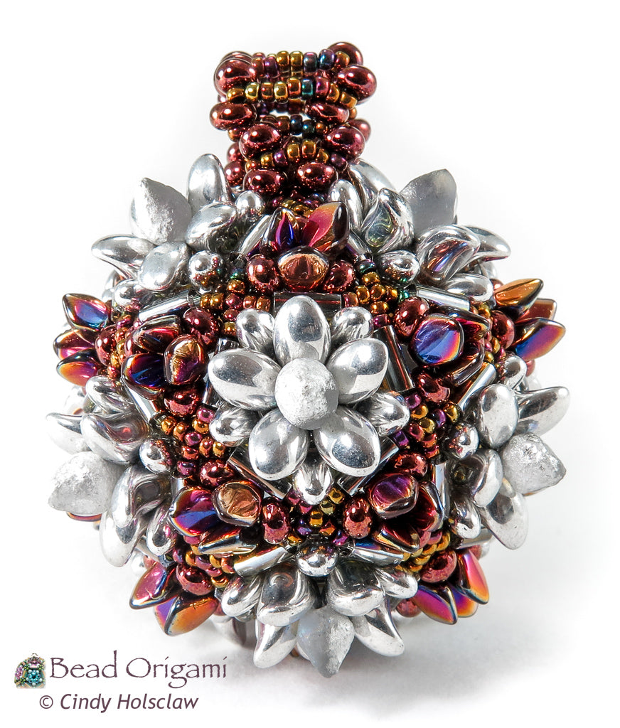This pattern is appropriate for beaders who are already proficient in right-angle weave (RAW) and who would like the challenge of trying a 3D variation of this stitch. Beaders who have stitched the Tila Garden Pendant or the Fiberoptic Dodecahedron are in great shape to try this design.