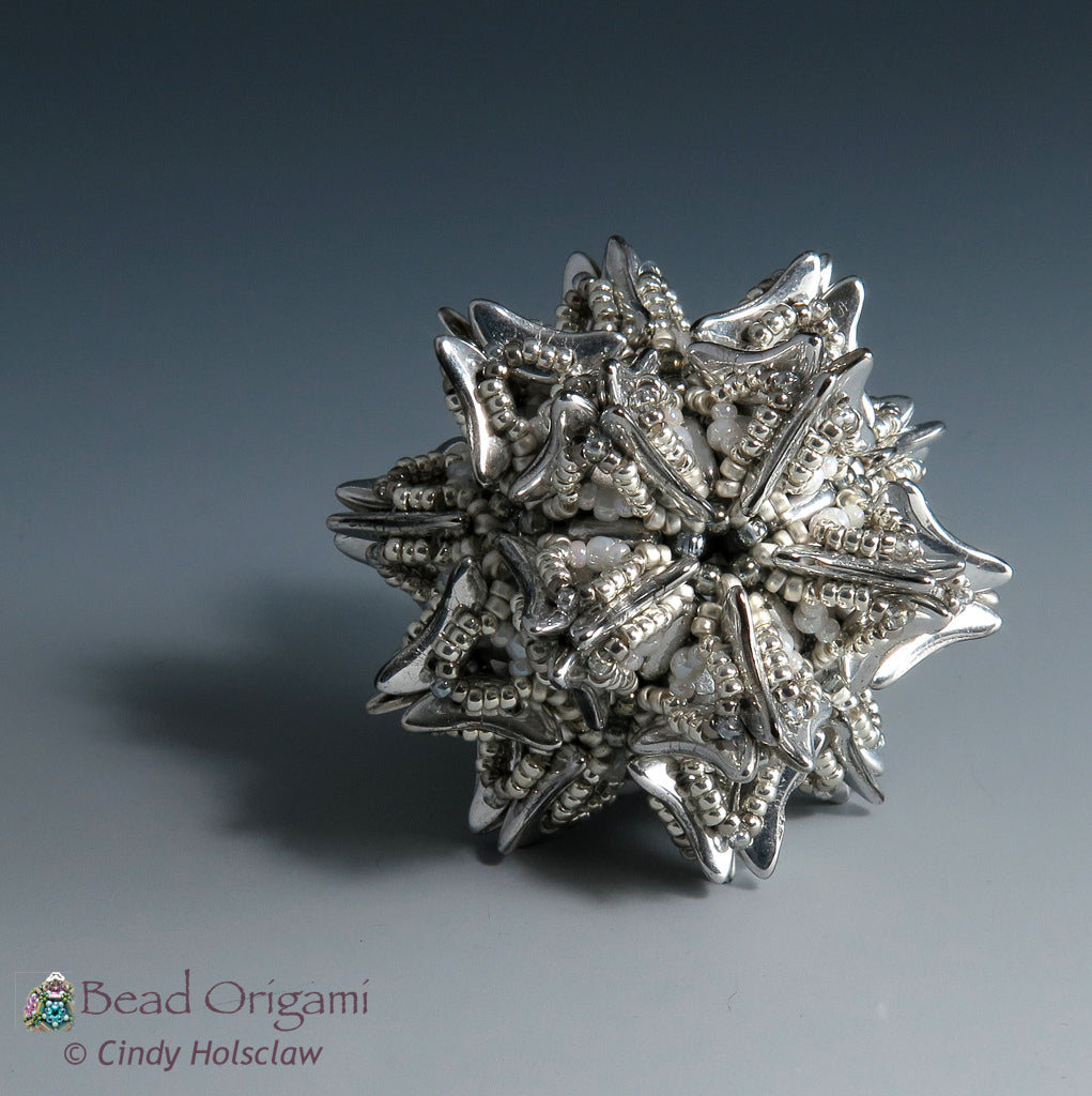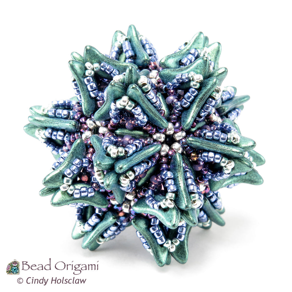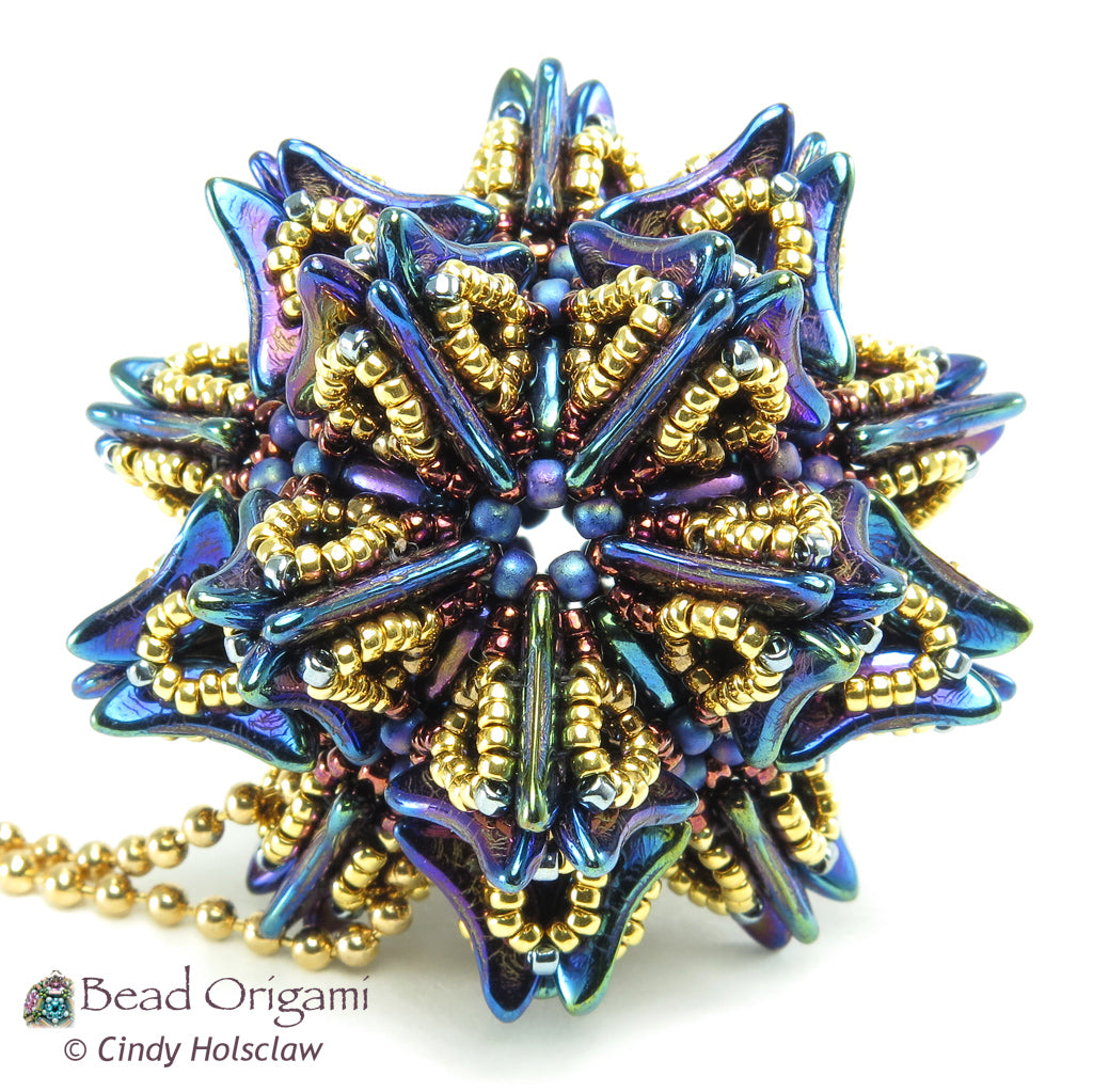 Create a fantastic bursting pendant with crescent beads! The Supernova beaded pendant features the geometry of the dodecahedron in a large pendant-sized beaded bead (check out my free Candy Dodecahedron pattern for an introduction to dodecahedron beaded beads). This self-supporting structure is covered with a network of spiky embellishments featuring 2-hole crescent beads and lacy network of Japanese seed beads. String and wear this intricate design as a solo pendant, or use it as a focal for a stunning necklace!