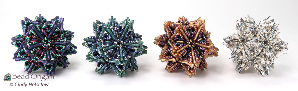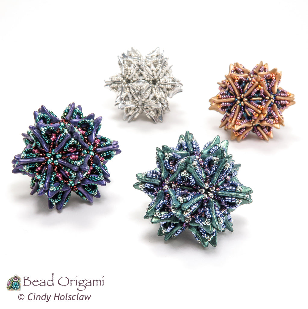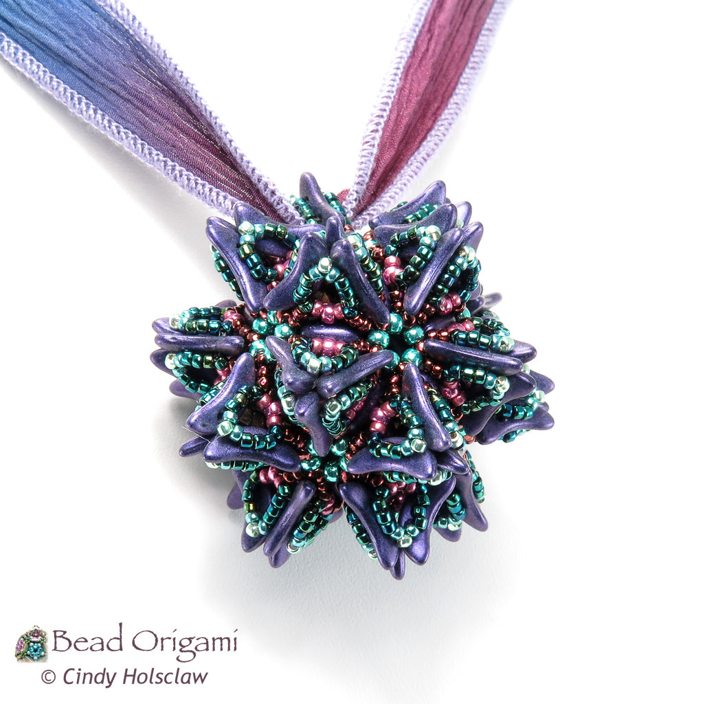 This pattern is appropriate for advanced beaders who have woven dodecahedron beaded beads before and who would like the challenge of incorporating 2-hole beads into a dodecahedron. Intermediate beaders who have stitched the Comet Trails Set are in great shape to try out this design. The pattern includes detailed step-by-step instructions showing how to weave the completed pendant, including the modified dodecahedron base. Combine this design with the components of the Comet Trails Set for even more possibilities.