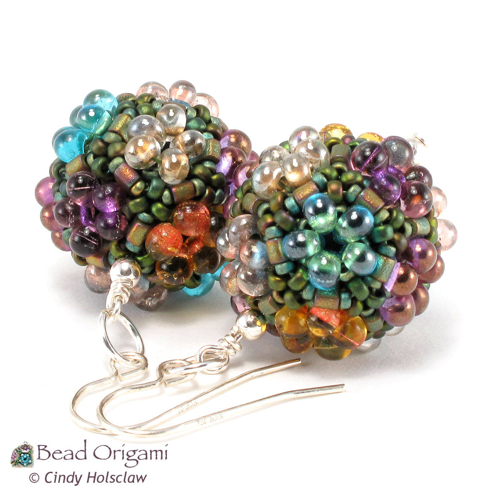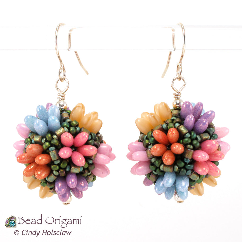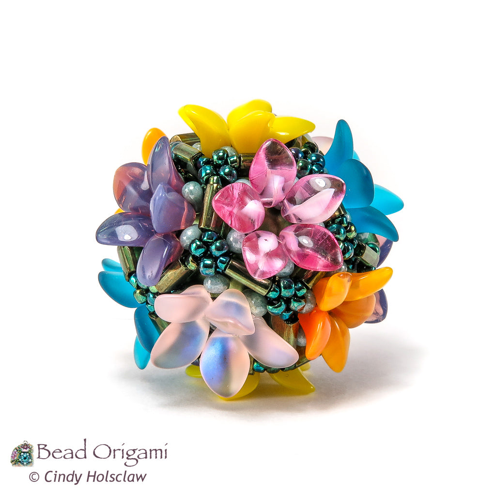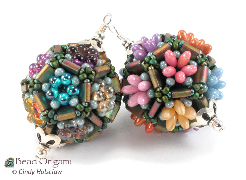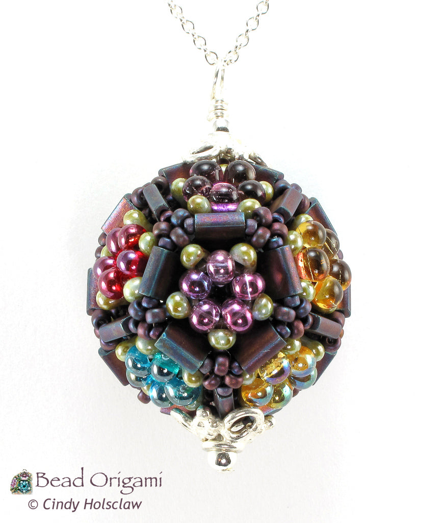 The Tila Garden Pendant uses the dual-hole Miyuki Tila beads to create little plots for flowers woven from shaped seed beads. This advanced design uses the geometry of a dodecahedron, and has enough sides for twelve different flowers all gathered on this one little pendant (Check out my free Candy Dodecahedron pattern for an introduction to dodecahedron beaded beads). The pattern explains how to weave the flowers in an even color distribution, so that no two flowers of the same color touch each other. This design could also serve as a stunning focal bead, or even as a miniature ornament.