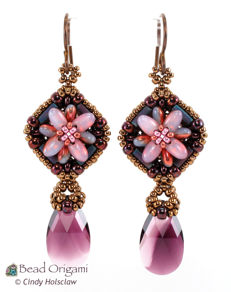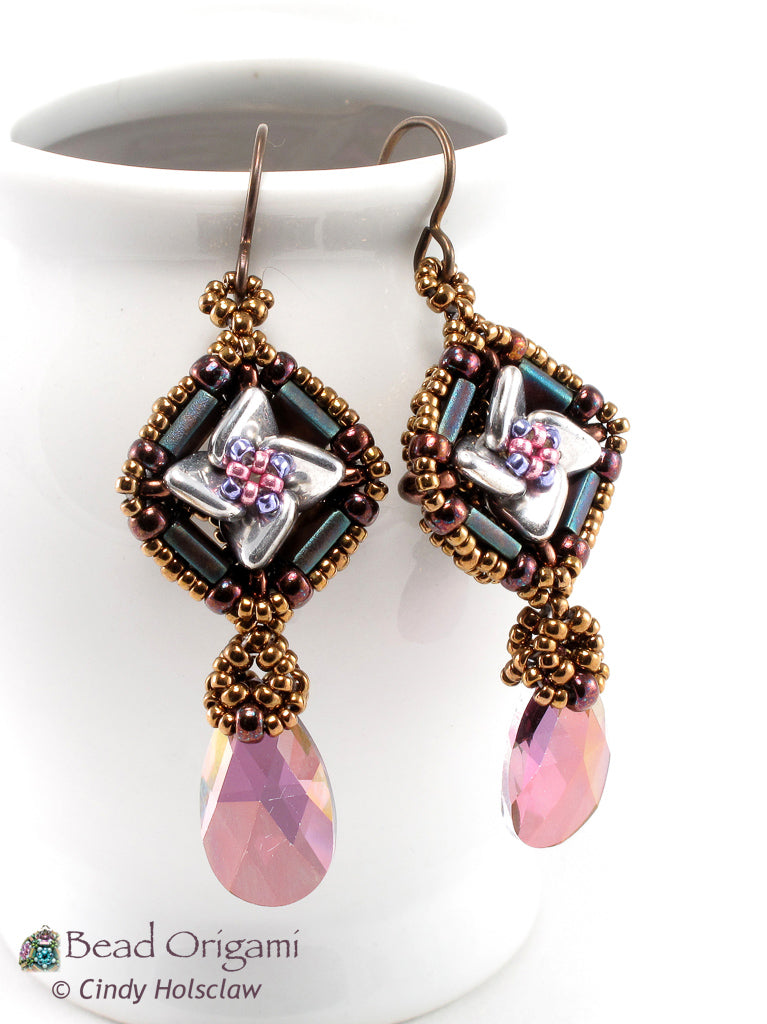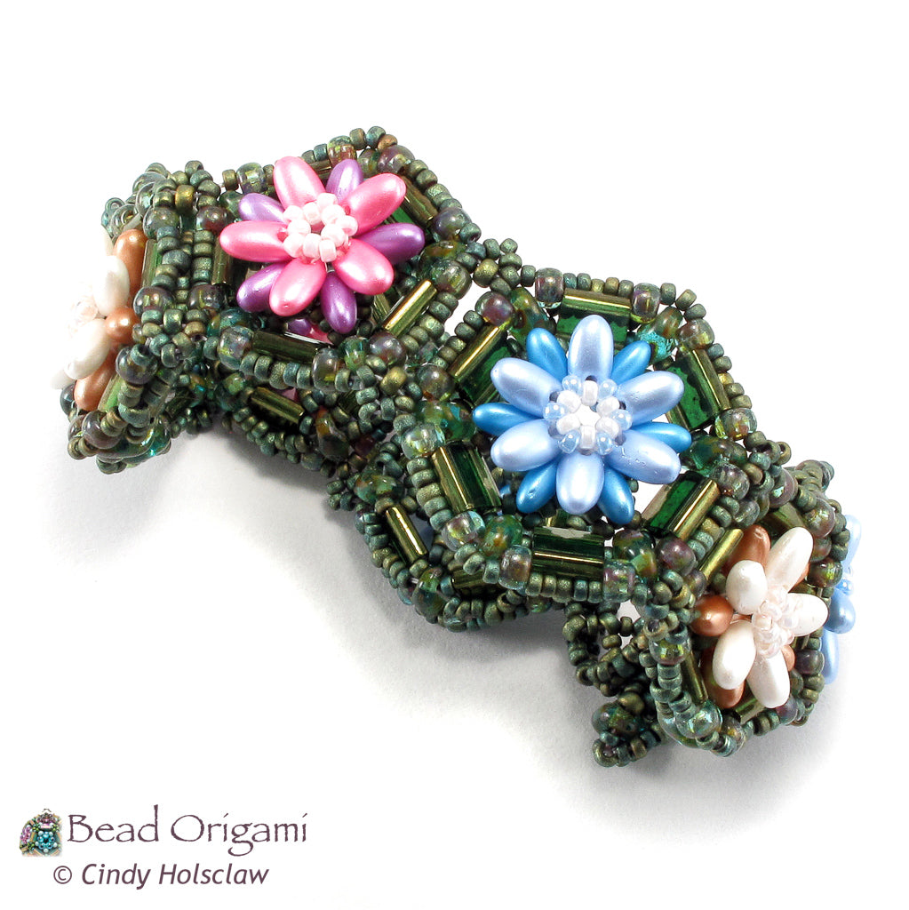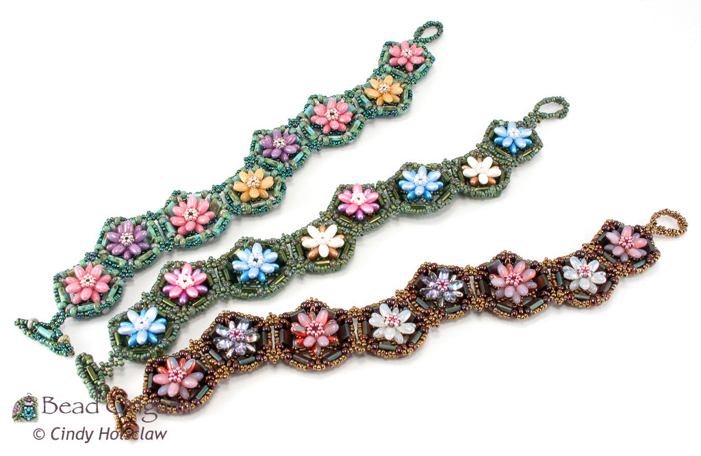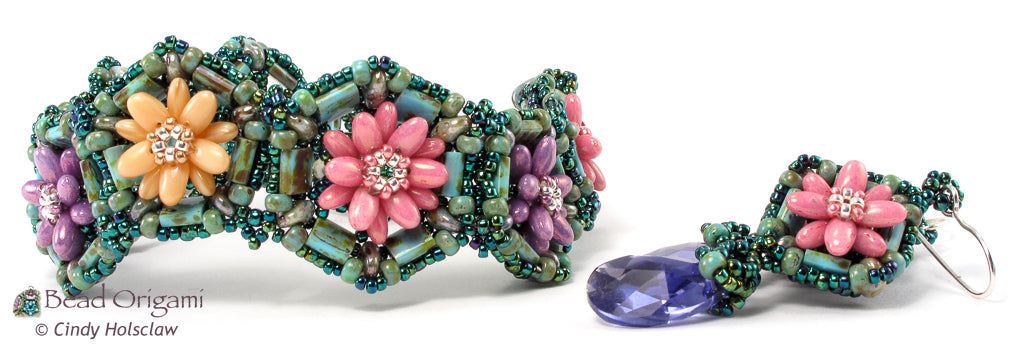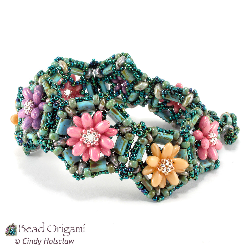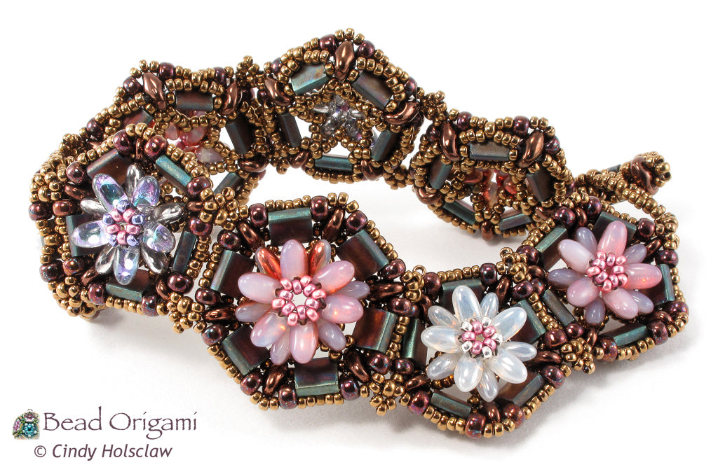 Create a twisting bracelet of floating water lilies, and complement it with matching earrings! The Water Lily Windows Set features three different shapes of Water Lily Windows components. These components surround petite flowers woven from Rizo beads with beaded frames woven from Tila beads, SuperDuo beads, and several sizes of Japanese seed beads. Each component is created using intricate variations of the right angle weave and circular netting stitches. Several of these floral components connect together for a bracelet, which is finished by a custom matching toggle clasp. Two more components pair with pear-shaped crystals for delicate matching earrings. Use these components to create necklaces, pendants, or even beaded beads.